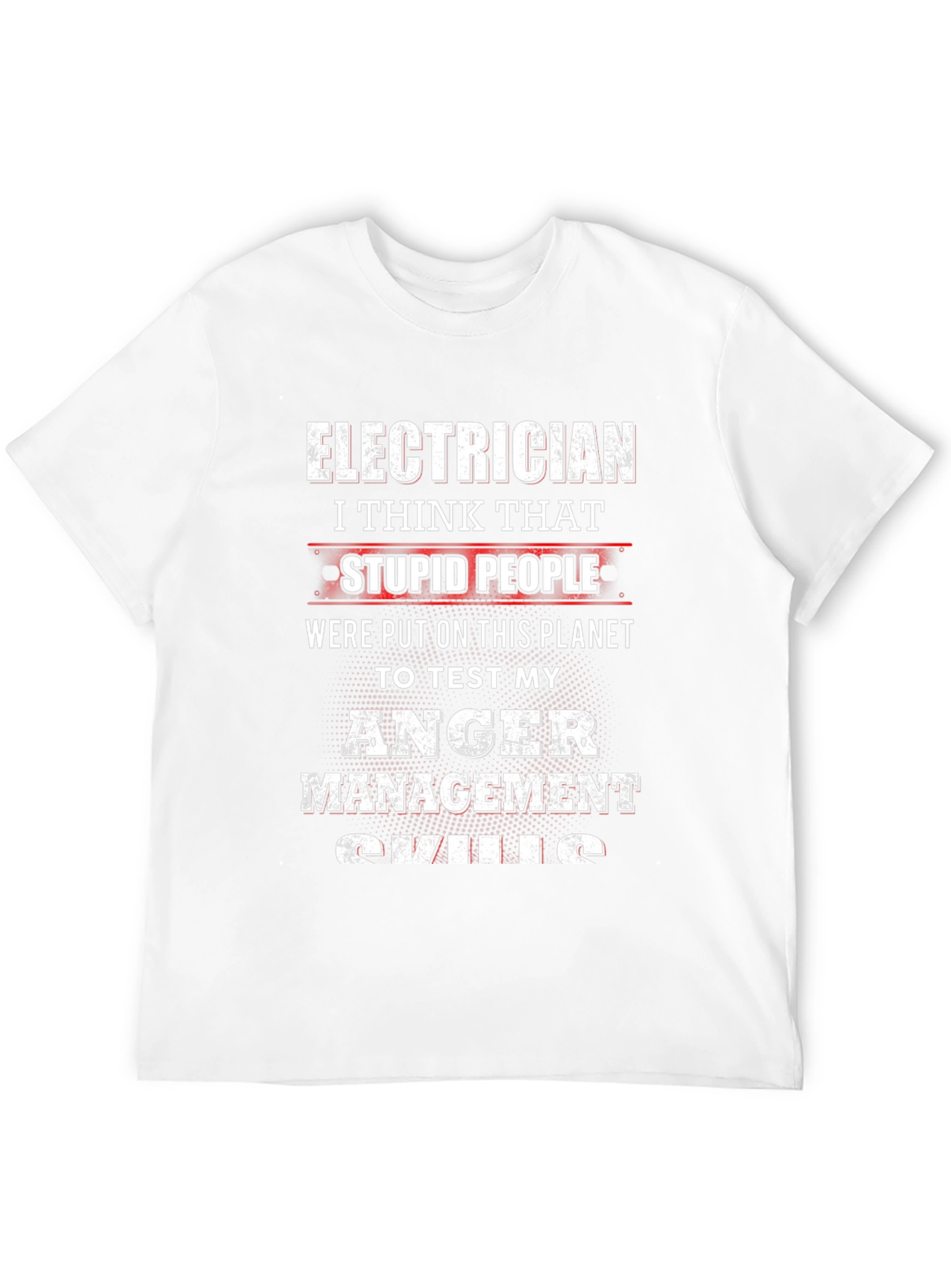 This black t-shirt features a humorous design. The shirt states: "ELECTRICIAN, I THINK THAT STUPID PEOPLE WERE PUT ON THIS PLANET TO TEST MY ANGER MANAGEMENT SKILLS". The design is printed in a distressed white font with red underlines. The shirt is a classic crew neck style and appears to be made of comfortable cotton. Perfect for electricians with a sense of humor or anyone who appreciates a witty statement tee. This shirt is sure to get a laugh and is ideal for casual wear.