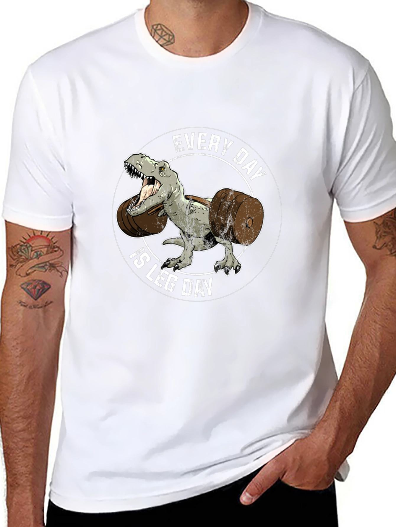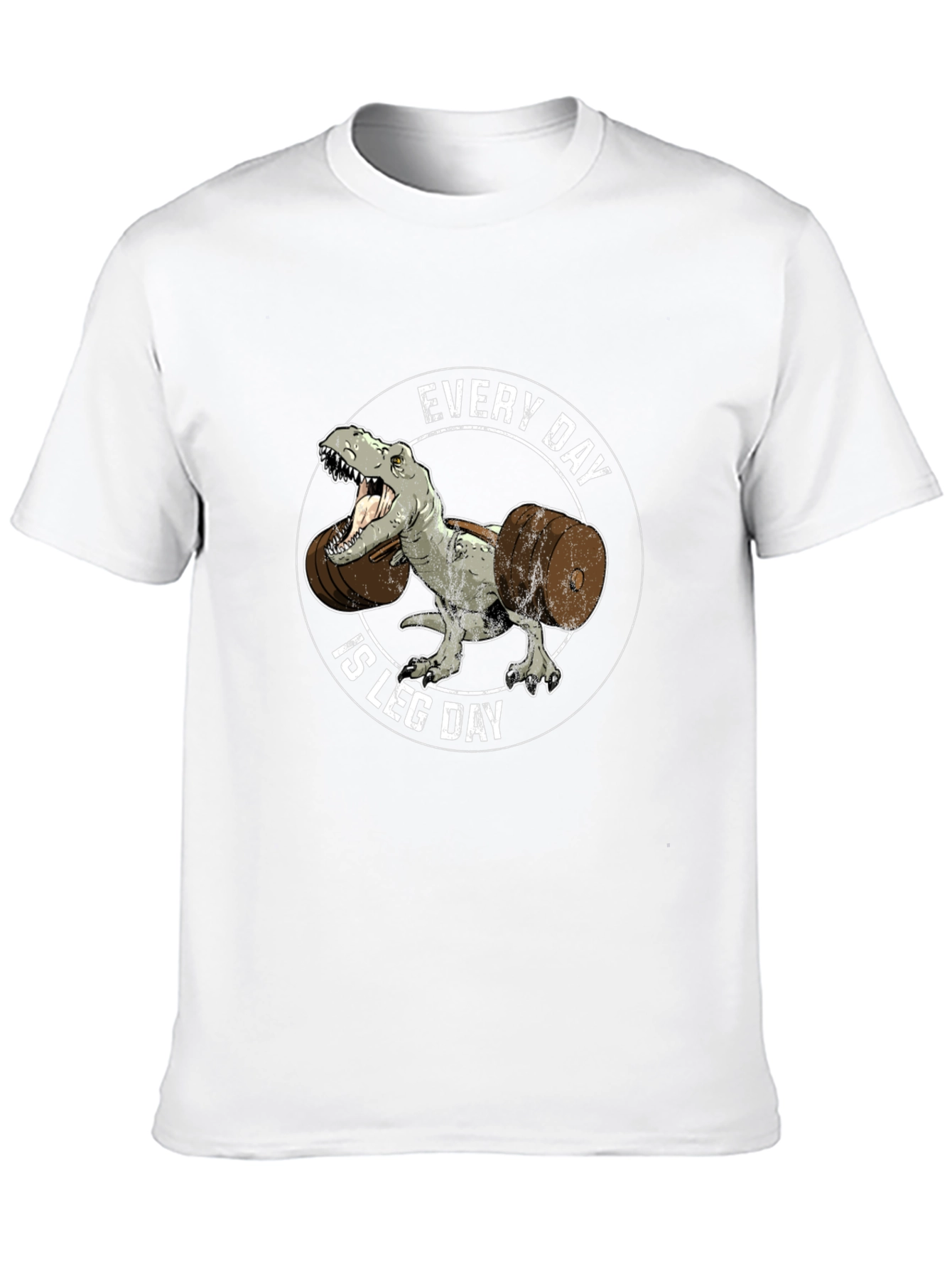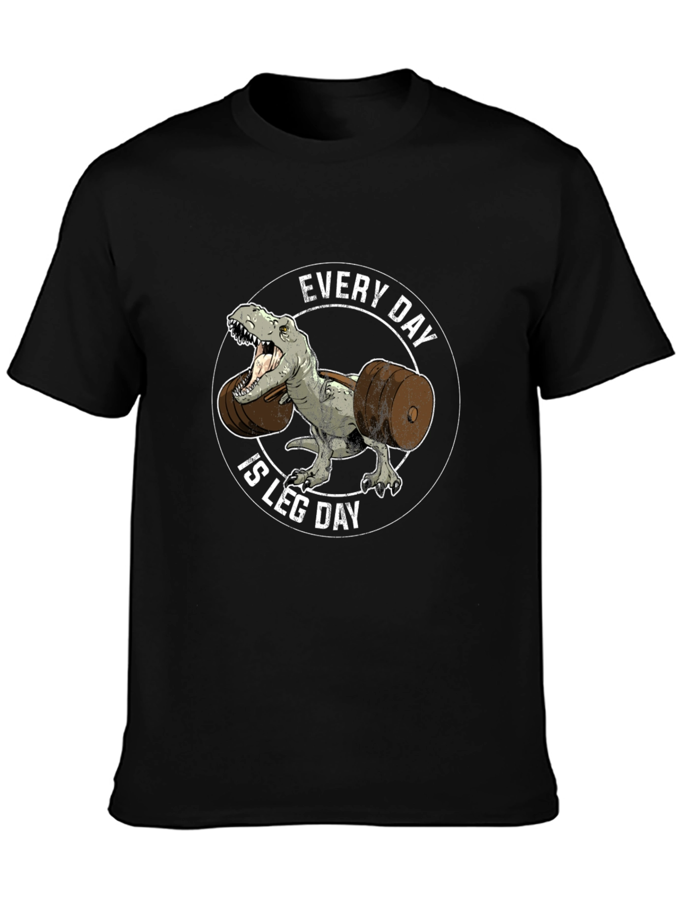 Show off your love for fitness and dinosaurs with this unique black t-shirt! The shirt features a cool graphic of a T-Rex lifting weights, circled by the phrase "Every Day is Leg Day". Made from a soft-looking fabric, this tee combines comfort and style. It's a great conversation starter at the gym, casual outings, or even lounging at home. Perfect for fitness enthusiasts, dinosaur lovers, or anyone who appreciates a witty graphic tee.