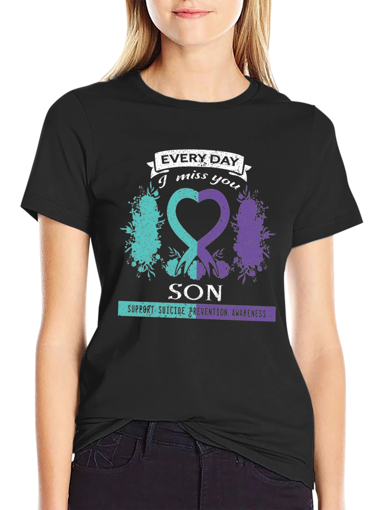 Show your support with this poignant "Everyday I Miss You Son" t-shirt. Featuring a heart-shaped suicide awareness ribbon embraced by floral designs, this tee blends remembrance with purpose. The phrase "SUPPORT SUICIDE PREVENTION AWARENESS" reinforces the message. Made from a comfortable fabric, it's perfect for raising awareness and honoring loved ones. Wear it to walks, memorial events, or as a daily reminder of the cause. Make a statement of hope and support with this meaningful piece.