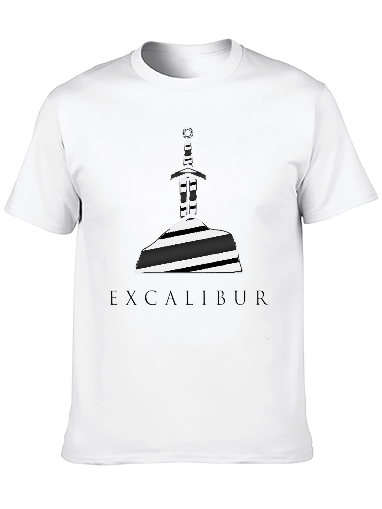 Embrace legendary style with this bold black t-shirt featuring the iconic Excalibur sword in the stone design. The graphic, rendered in striking black and white, makes a statement. The word "EXCALIBUR" is printed below the sword. Made from a soft, breathable fabric, this tee offers all-day comfort and a relaxed fit. Perfect for casual wear, fantasy enthusiasts, or anyone who appreciates a touch of mythic flair. This t-shirt is sure to become a favorite in your wardrobe. Wear your legend!