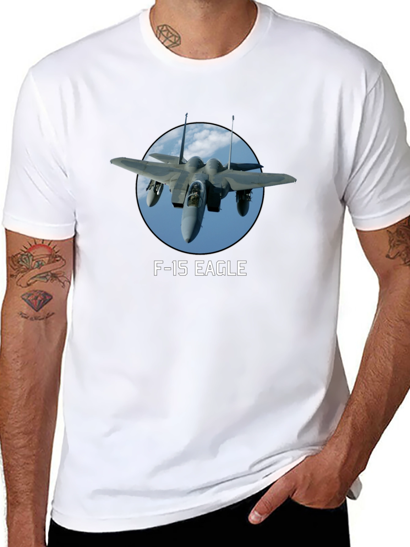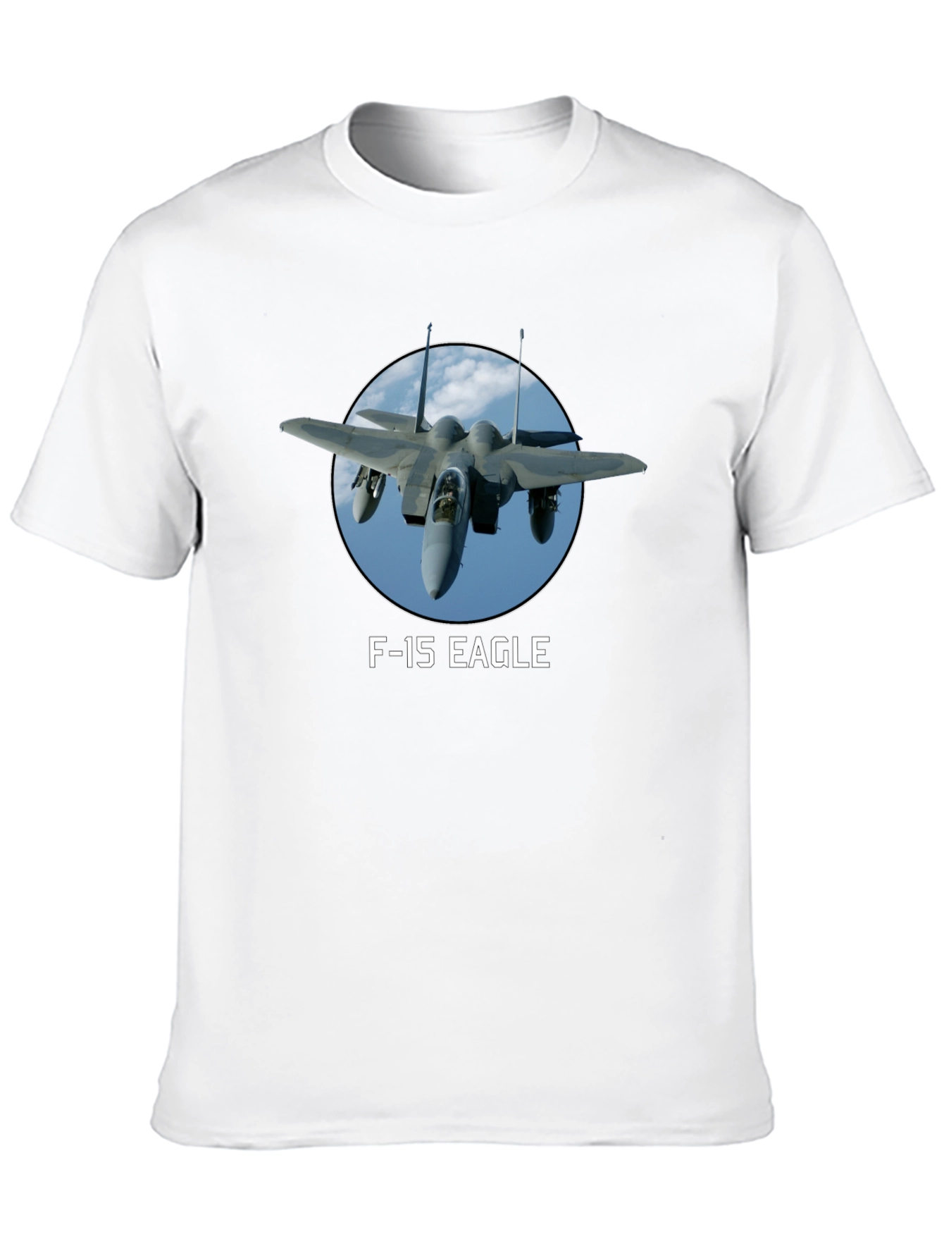 Show your love for aviation with this striking black t-shirt featuring a high-quality graphic of the F-15 Eagle jet fighter. The detailed image, set within a clean circle design with the plane's name, creates a bold and stylish statement. Made from comfortable materials, this tee is perfect for casual wear, air shows, or as a unique gift for aviation enthusiasts. Pair it with jeans or shorts for a relaxed yet eye-catching look. This t-shirt is sure to be a conversation starter, letting you showcase your passion for military aircraft wherever you go.