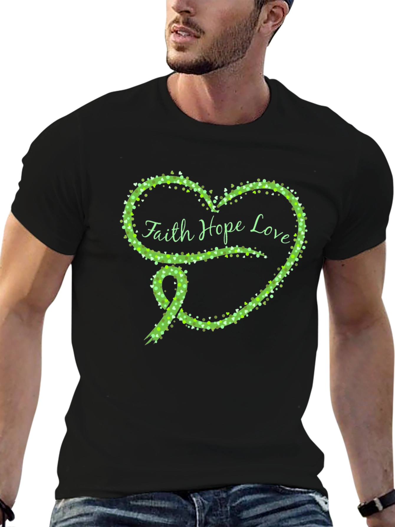 Show your support with this unique black t-shirt featuring a sparkling green heart intertwined with a ribbon. Emblazoned with the words 'Faith Hope Love', this design symbolizes strength, resilience, and unwavering optimism. The vibrant green contrasts beautifully against the dark backdrop, making the message pop. The shirt appears to be made from a soft, comfortable fabric. Ideal for raising awareness, showing solidarity, or simply expressing a positive outlook. A meaningful piece for everyday wear or special events. Get yours today!