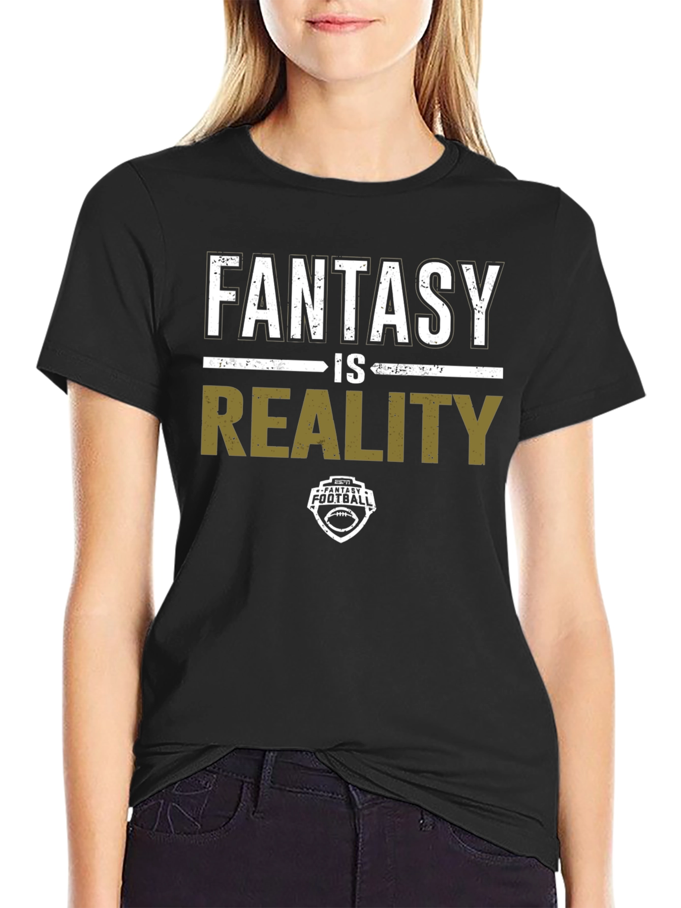 Show your passion for fantasy football with this stylish black t-shirt. The shirt features the words "Fantasy" and "Reality" in bold lettering, separated by "Is" with an arrow design. Below, a football graphic proudly displays the words "Fantasy Football." Made from a comfortable material, this tee is perfect for game days, drafts, or casual wear. Let everyone know that fantasy football is your reality!