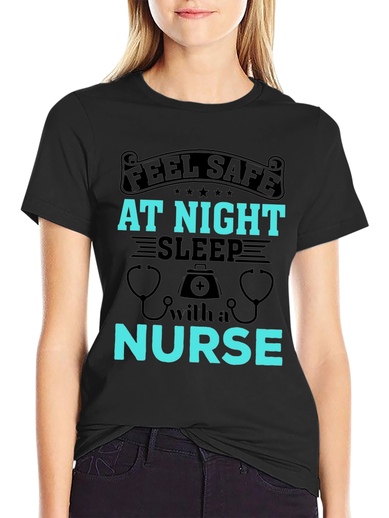 This black t-shirt features a playful graphic design that makes it a unique and eye-catching piece. The design includes the text "FEEL SAFE AT NIGHT SLEEP with a NURSE" in a bold cyan color. The shirt also has medical symbols like stethoscopes and a first aid kit icon to further emphasize the nursing theme. Made from a comfortable, soft fabric, this tee is perfect for casual wear, themed parties, or as a fun gift for nurses or nursing students. The design is printed with high-quality ink to ensure longevity and vibrancy. Ideal for expressing your appreciation for healthcare professionals in a lighthearted way.