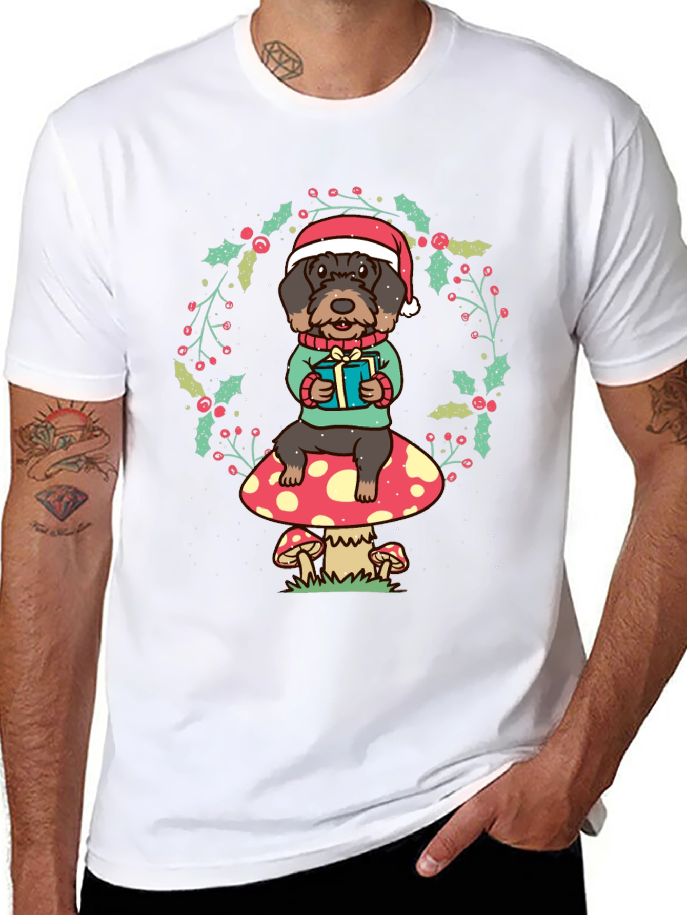 Spread holiday cheer with this adorable Christmas T-shirt! Featuring a cute dog wearing a Santa hat and holding a gift, the charming design is set against a festive holly wreath. The dog sits atop a whimsical mushroom, adding a touch of fantasy to the scene. Made from comfortable, breathable fabric, this black T-shirt is perfect for casual wear during the holiday season. Ideal for dog lovers and anyone looking to add a fun, festive touch to their wardrobe. Great for holiday parties, family gatherings, or everyday wear to show off your Christmas spirit!