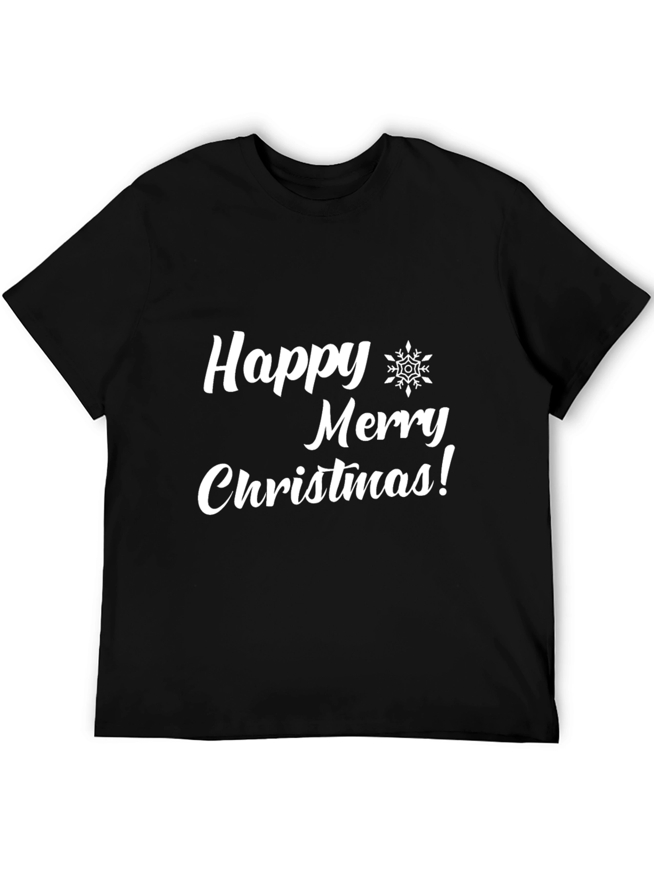 Spread holiday cheer with this black 'Happy Merry Christmas' graphic t-shirt. The design features festive script font and a snowflake symbol, perfect for holiday gatherings or casual wear. Made from comfortable material, this tee offers a relaxed fit for all-day comfort. A stylish way to celebrate the season, this shirt is a must-have for anyone looking to add a touch of holiday spirit to their wardrobe. Pair it with jeans for a casual look or dress it up with a blazer for a festive event. Get yours now and make a statement this Christmas!