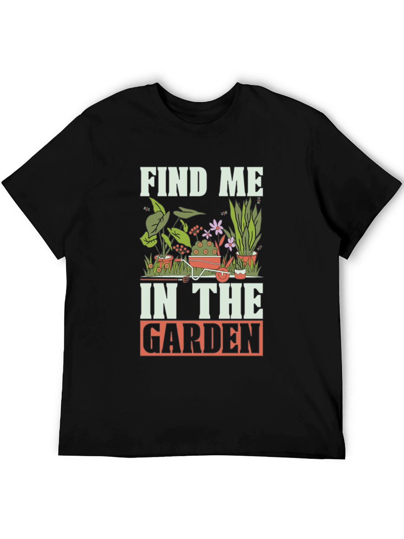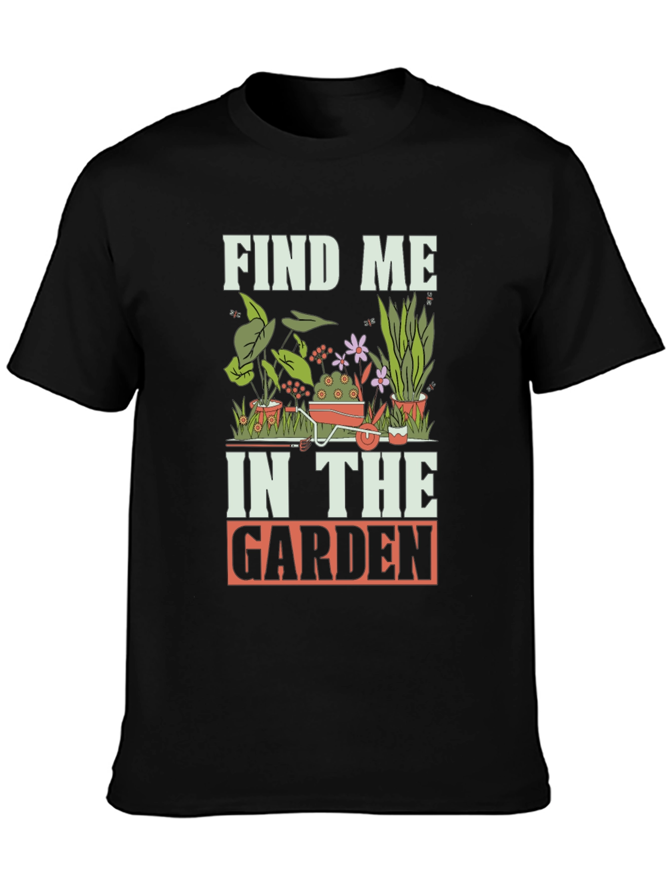 This classic black t-shirt features a charming graphic design perfect for garden lovers. The design includes potted plants, a wheelbarrow full of greenery, and the phrase "FIND ME IN THE GARDEN." The print has a vintage-inspired look. Made from soft, breathable fabric, this tee is comfortable for everyday wear, whether you're tending to your garden or simply relaxing outdoors. It’s a great gift for the green thumb in your life or a stylish way to express your passion for gardening. Pair it with jeans or shorts for a casual, comfortable look.