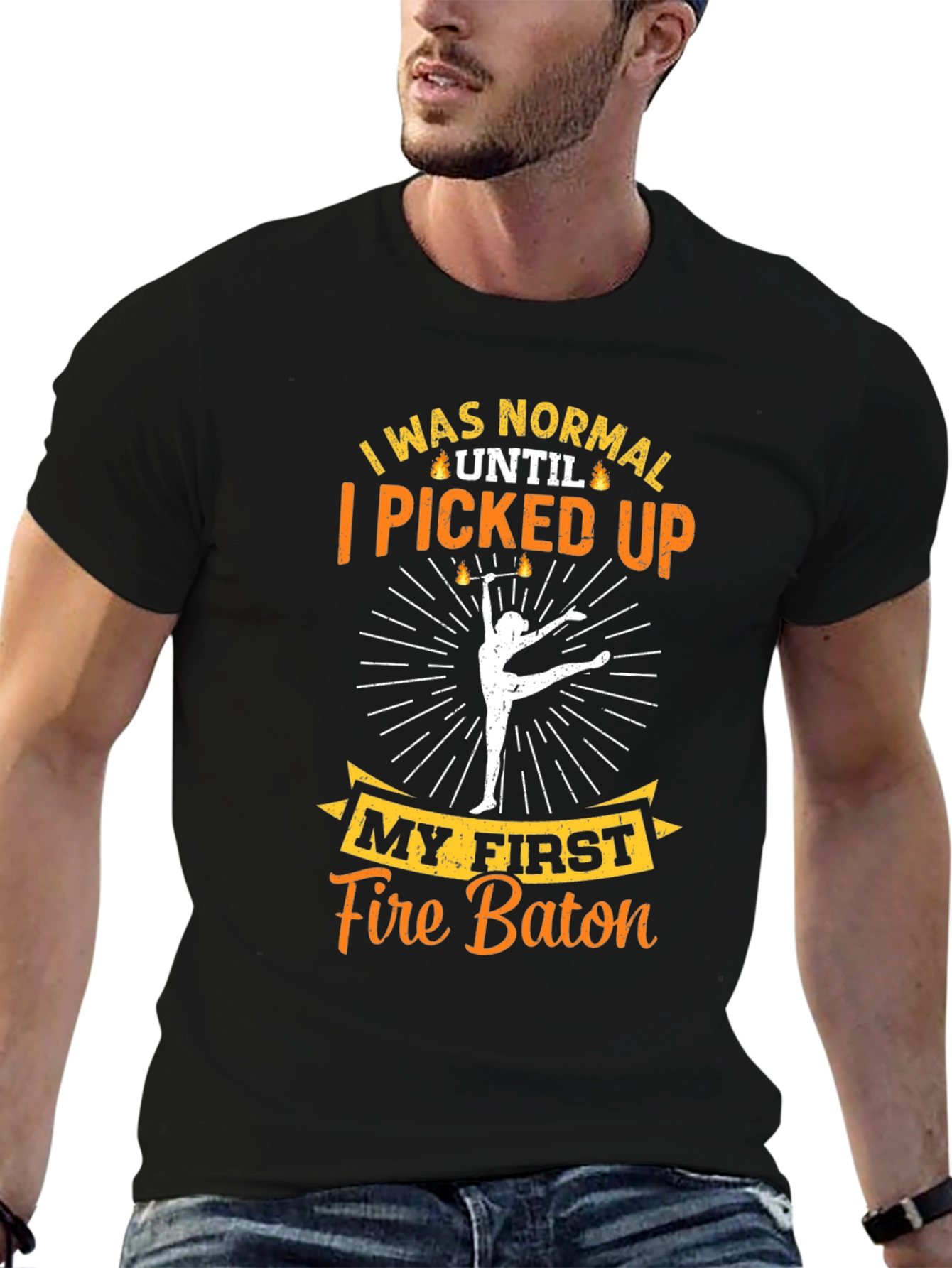 Show off your passion for baton twirling with this unique t-shirt! Featuring a playful design with the phrase 'I was normal until I picked up my first Fire Baton,' this shirt is perfect for fire baton enthusiasts. The eye-catching graphic includes a silhouette of a baton twirler surrounded by radiating lines, creating a dynamic and energetic look. Made from a comfortable, likely cotton blend, this tee is ideal for casual wear, practices, or showing your pride at competitions. Get yours today and let everyone know about your fiery talent!