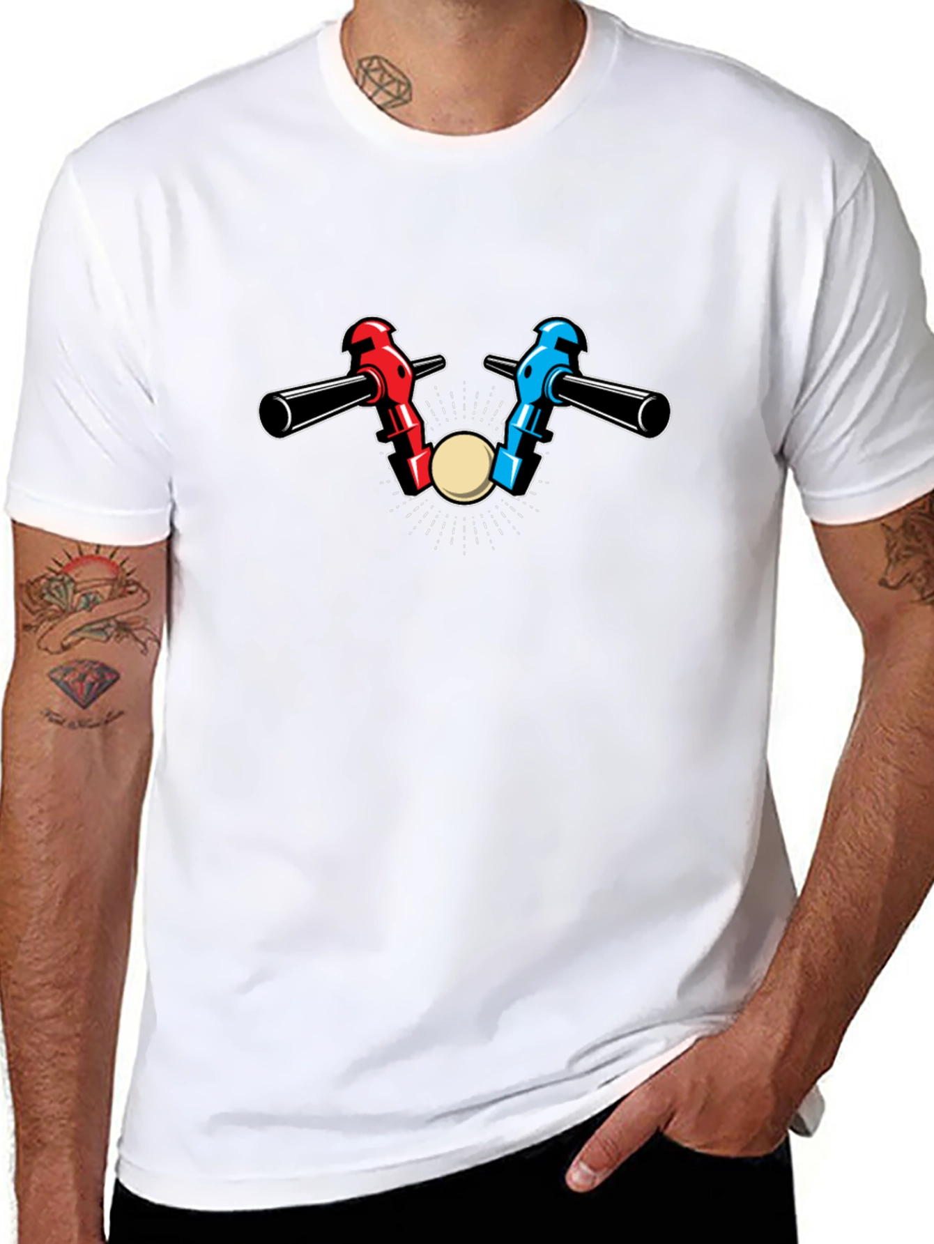 Show off your love for foosball with this eye-catching black t-shirt. The shirt features a vibrant graphic of two foosball players facing off, one in red and the other in blue, ready to strike the ball. The design pops against the classic black background, making it a stylish choice for casual wear. Made from comfortable materials, this t-shirt is perfect for everyday use or wearing to your next game night. Whether you're a seasoned foosball pro or just enjoy a friendly match, this shirt is sure to be a conversation starter.