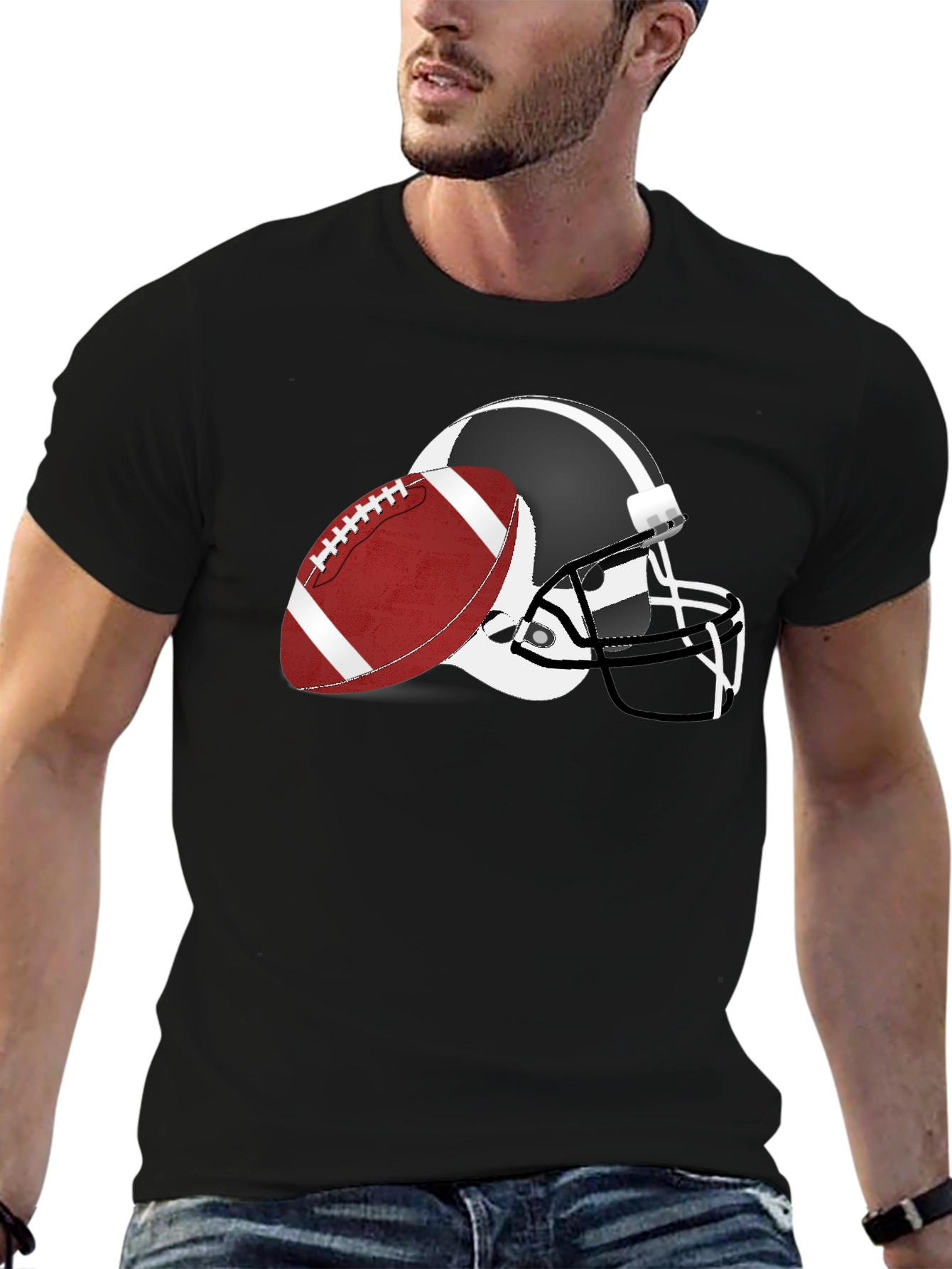 Showcase your love for football with this stylish black graphic tee! Featuring a bold design of a football helmet and ball, this shirt is perfect for game days, casual outings, or showing off your team spirit. The design provides a sporty look and is sure to attract attention. Made from a comfortable material, this t-shirt offers a great fit and feels soft against the skin. Upgrade your wardrobe with this unique graphic tee!