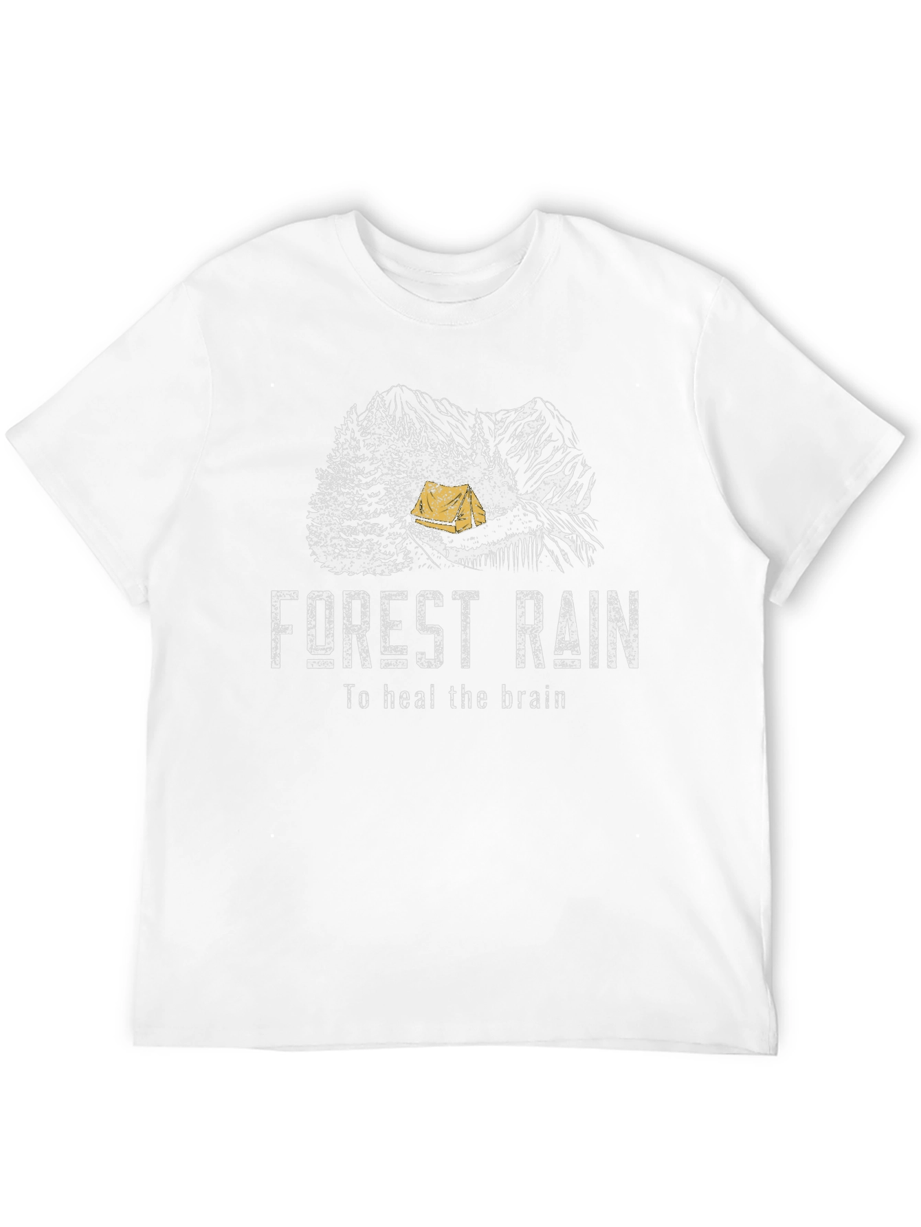 Embrace the tranquility of nature with our Forest Rain T-Shirt. Crafted from soft, breathable fabric, this black tee features a unique design showcasing a serene mountain landscape with a cozy tent nestled amidst the trees. The words "Forest Rain" are boldly printed above the phrase "To heal the brain," evoking a sense of peace and escape. Perfect for outdoor enthusiasts, nature lovers, or anyone seeking a calming aesthetic, this shirt is ideal for everyday wear, camping trips, or casual outings. Let the soothing imagery transport you to a tranquil forest, no matter where you are.
