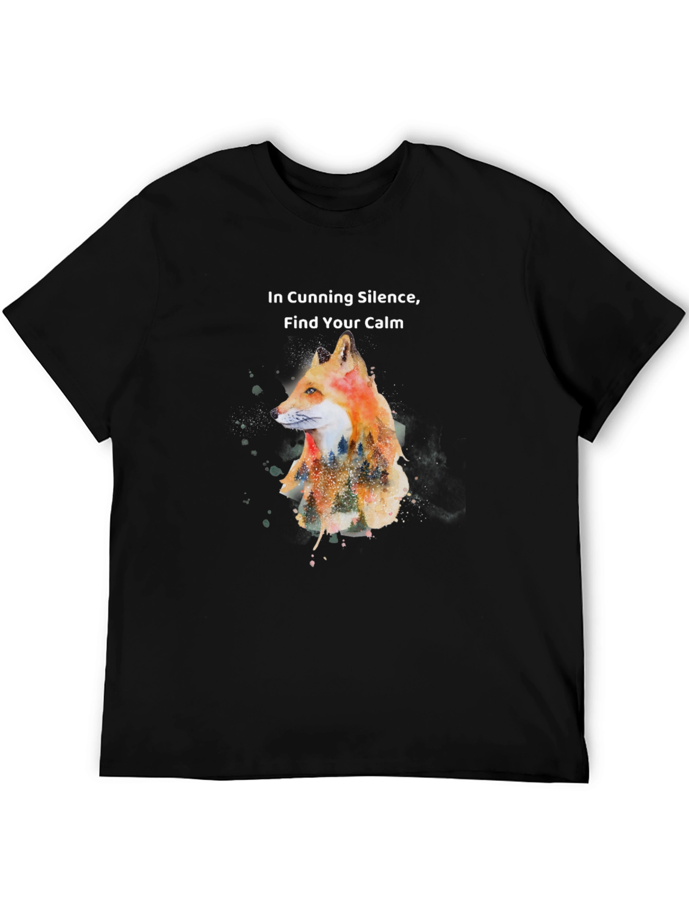 Embrace tranquility with our unique Fox Calm T-Shirt. Featuring a striking watercolor-style fox design intertwined with a serene forest scene, and the words 'In Cunning Silence, Find Your Calm.' printed above the fox, this shirt embodies peace and nature's beauty. The design is set against a classic black, short-sleeve t-shirt, perfect for everyday wear. Ideal for nature lovers and those seeking a touch of zen in their wardrobe. Made with comfortable, breathable fabric for a relaxed fit. Make a statement with this artistic and calming piece.