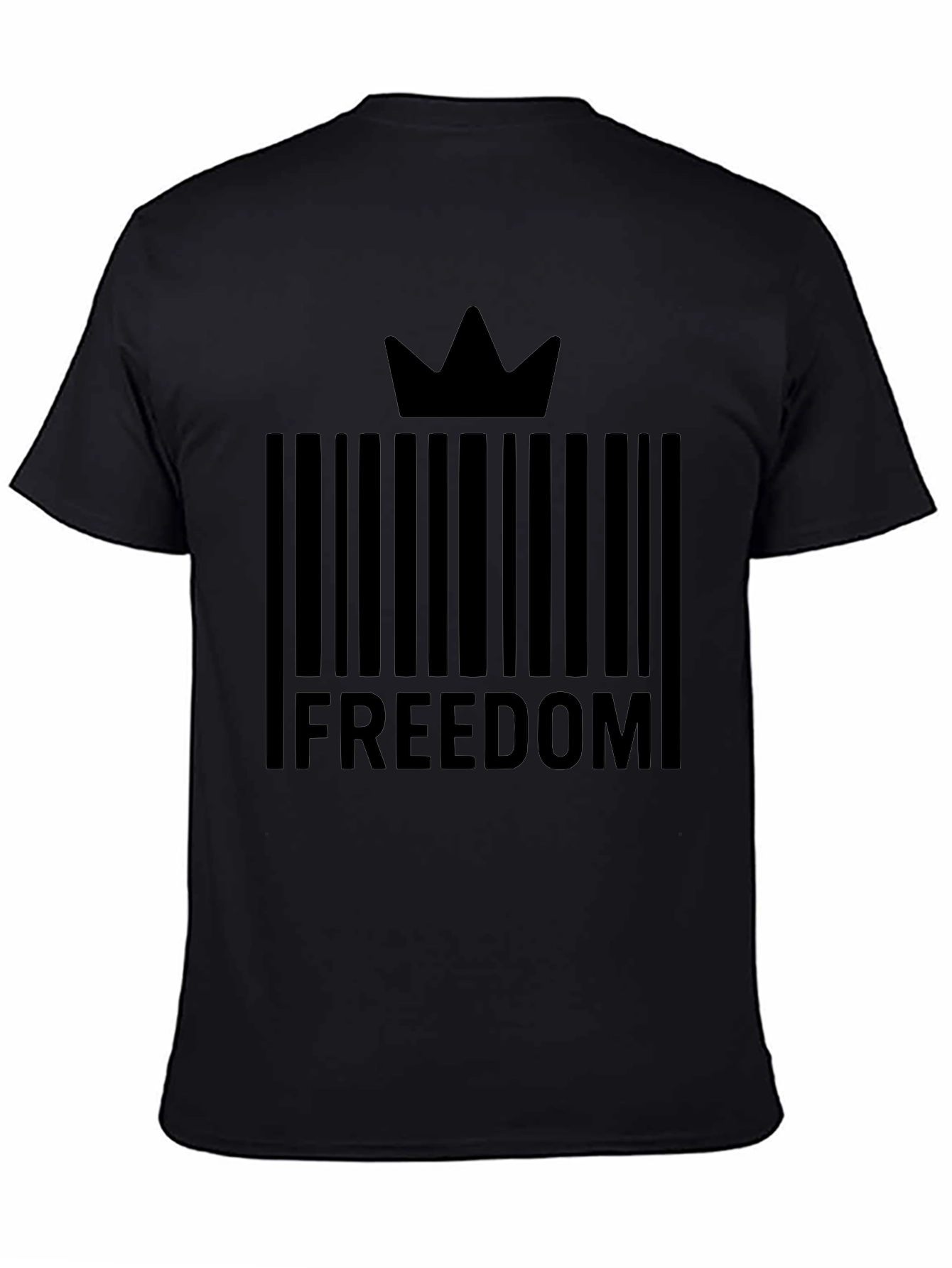 Show your spirit of liberty with this unique graphic tee. The design features a bold black barcode element with a stylized crown above, underscored by the word 'FREEDOM'. The design stands out on the dark fabric of the shirt. The shirt has short sleeves and crew neck. This tee is perfect for casual wear, making a statement wherever you go. Made with comfortable materials, this shirt offers both style and comfort. Great for everyday wear, social gatherings, or as a gift for someone who values independence.