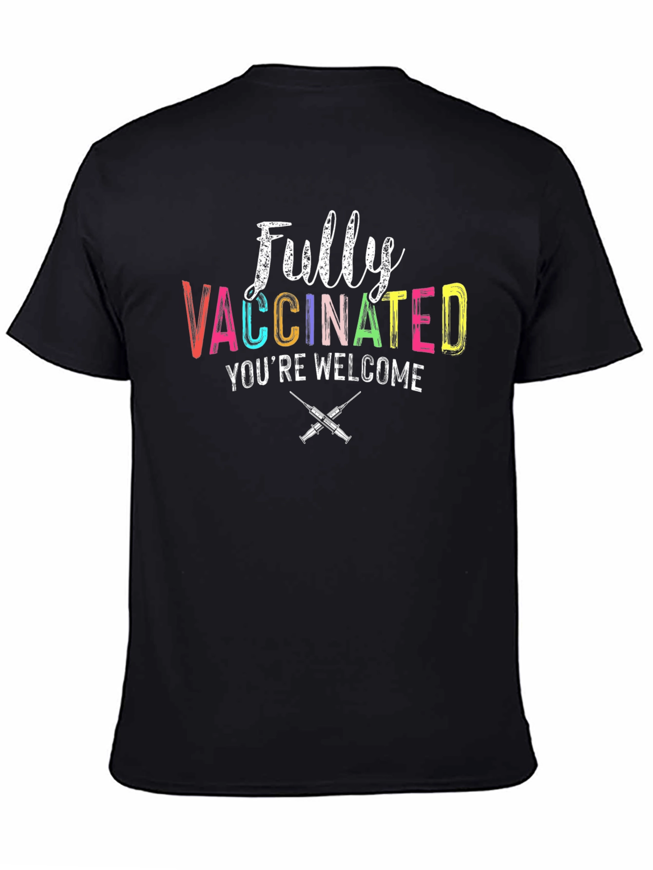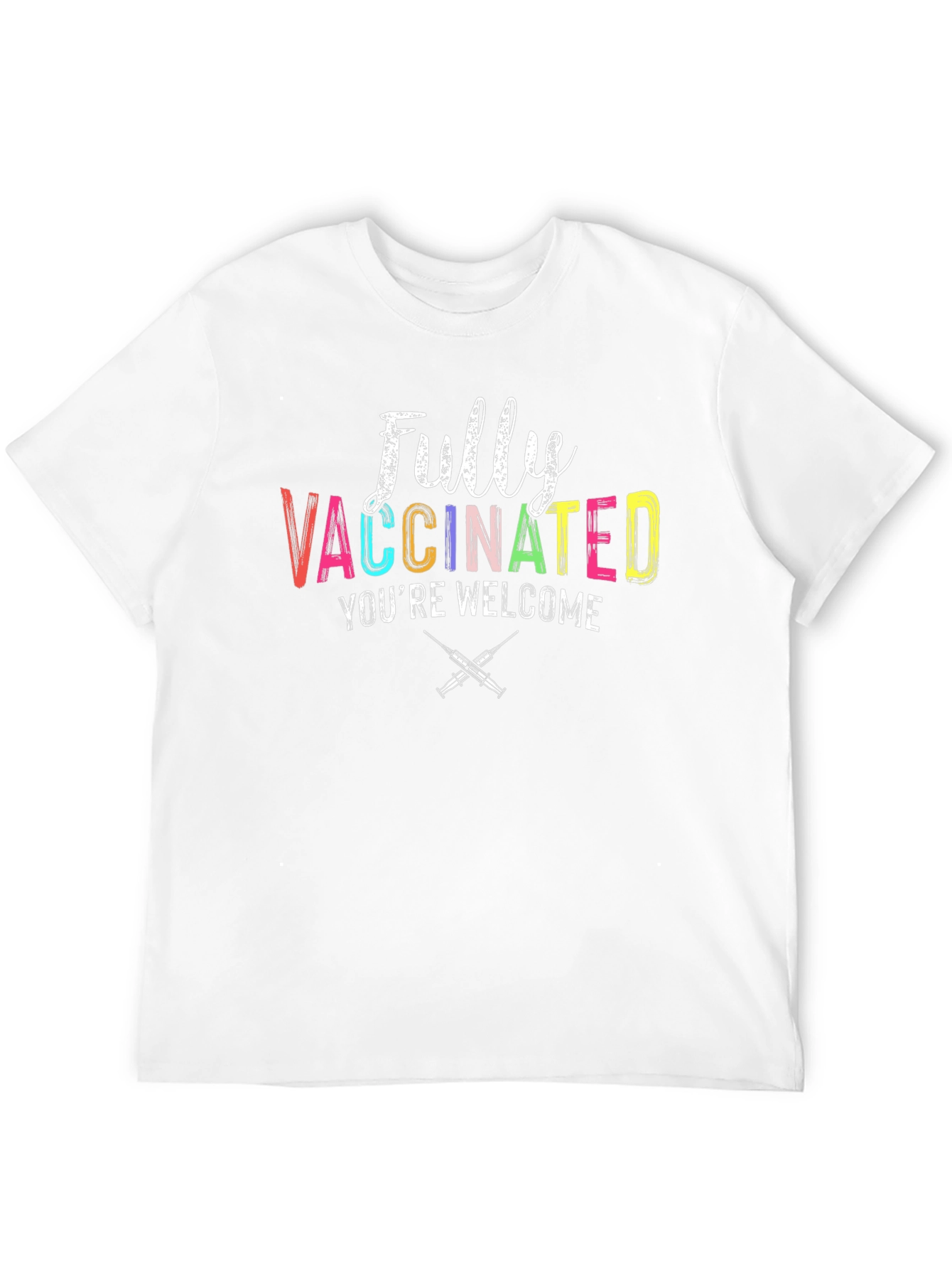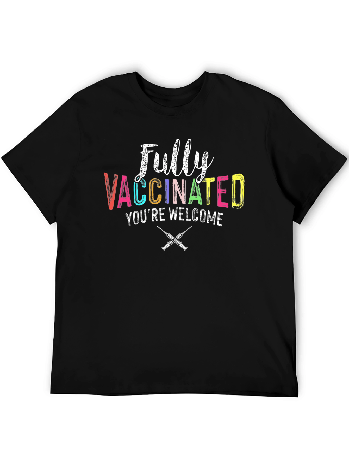 Show your support for vaccinations with this playful graphic tee. The black t-shirt features a colorful design with the words 'Fully Vaccinated' and 'You're Welcome' printed in a variety of vibrant hues. Two crossed syringes add a visual element. Made from a soft, breathable fabric, this tee is comfortable for everyday wear. It's a fun way to make a statement and spark conversation. Ideal for casual outings, rallies, or simply expressing your personal beliefs. A great gift for healthcare workers and pro-vaccine advocates.