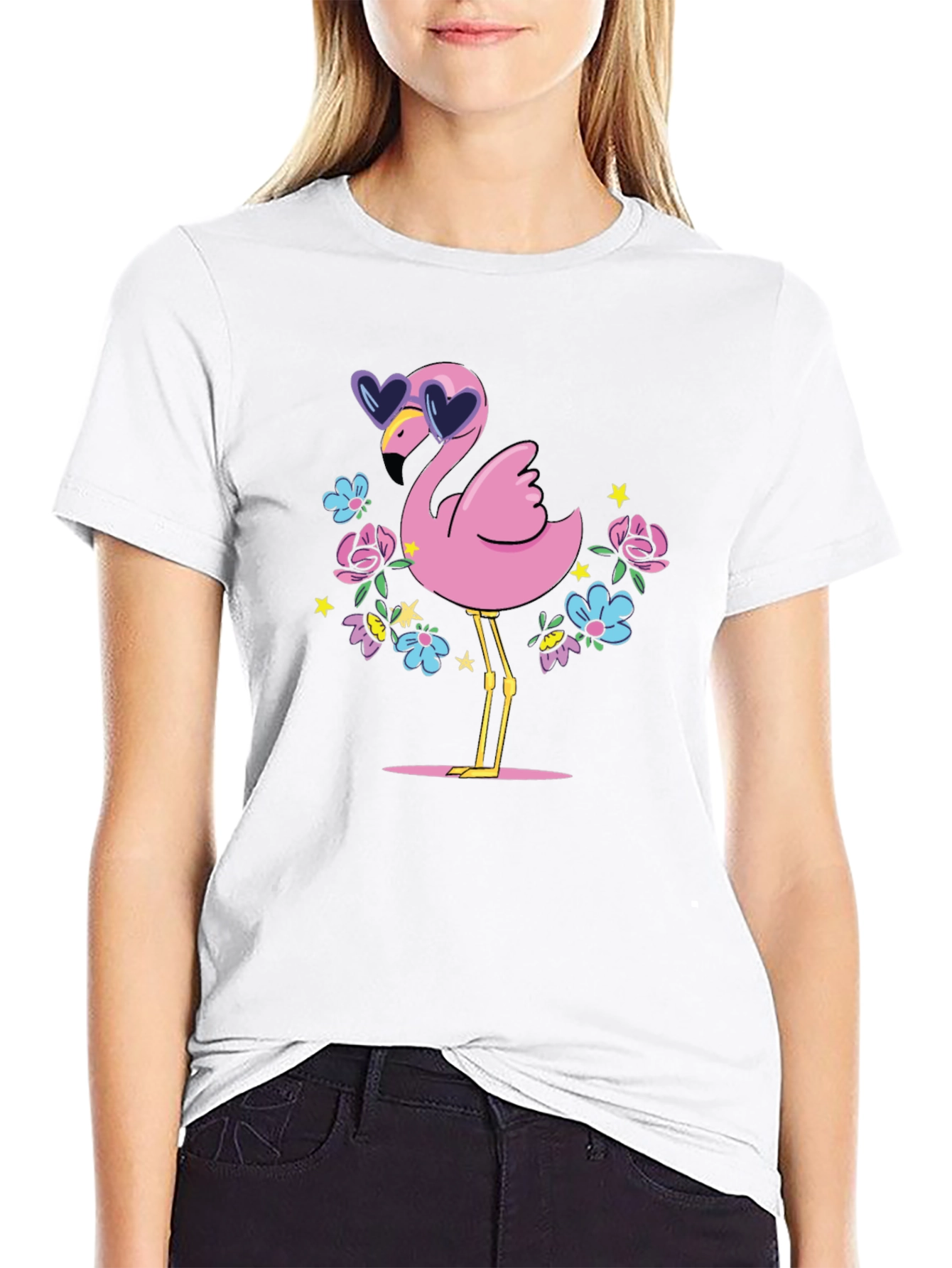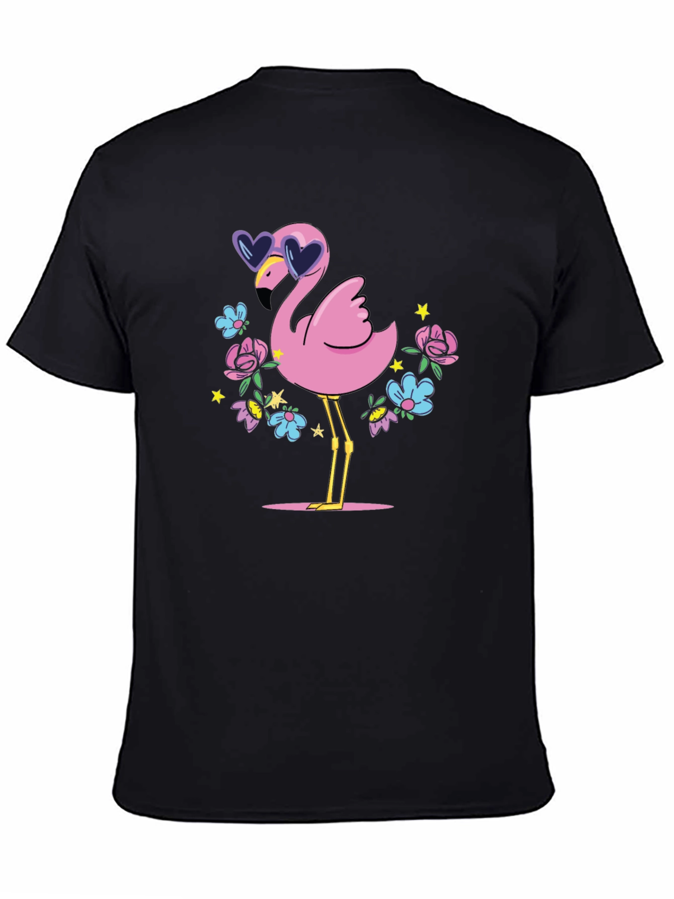 Show off your playful side with this fun graphic tee. This black t-shirt features a stylish pink flamingo wearing heart-shaped sunglasses, surrounded by vibrant flowers and stars. Made from comfortable cotton, it's perfect for casual everyday wear. The bold graphic print is eye-catching and adds a touch of whimsy to any outfit. Ideal for summer outings, beach days, or simply lounging around. Stand out from the crowd with this unique and trendy t-shirt. A must-have for flamingo lovers and anyone who appreciates a fun fashion statement!