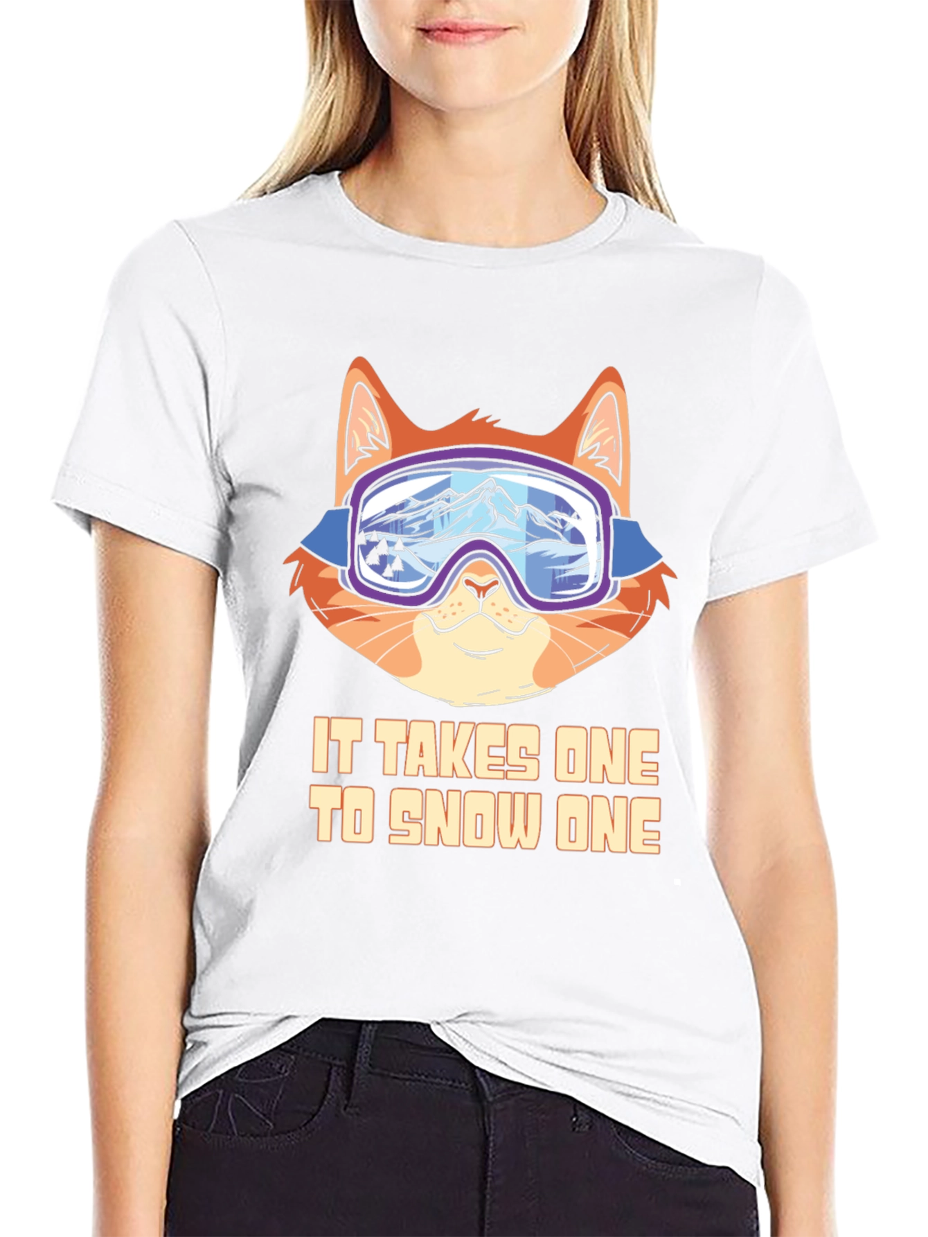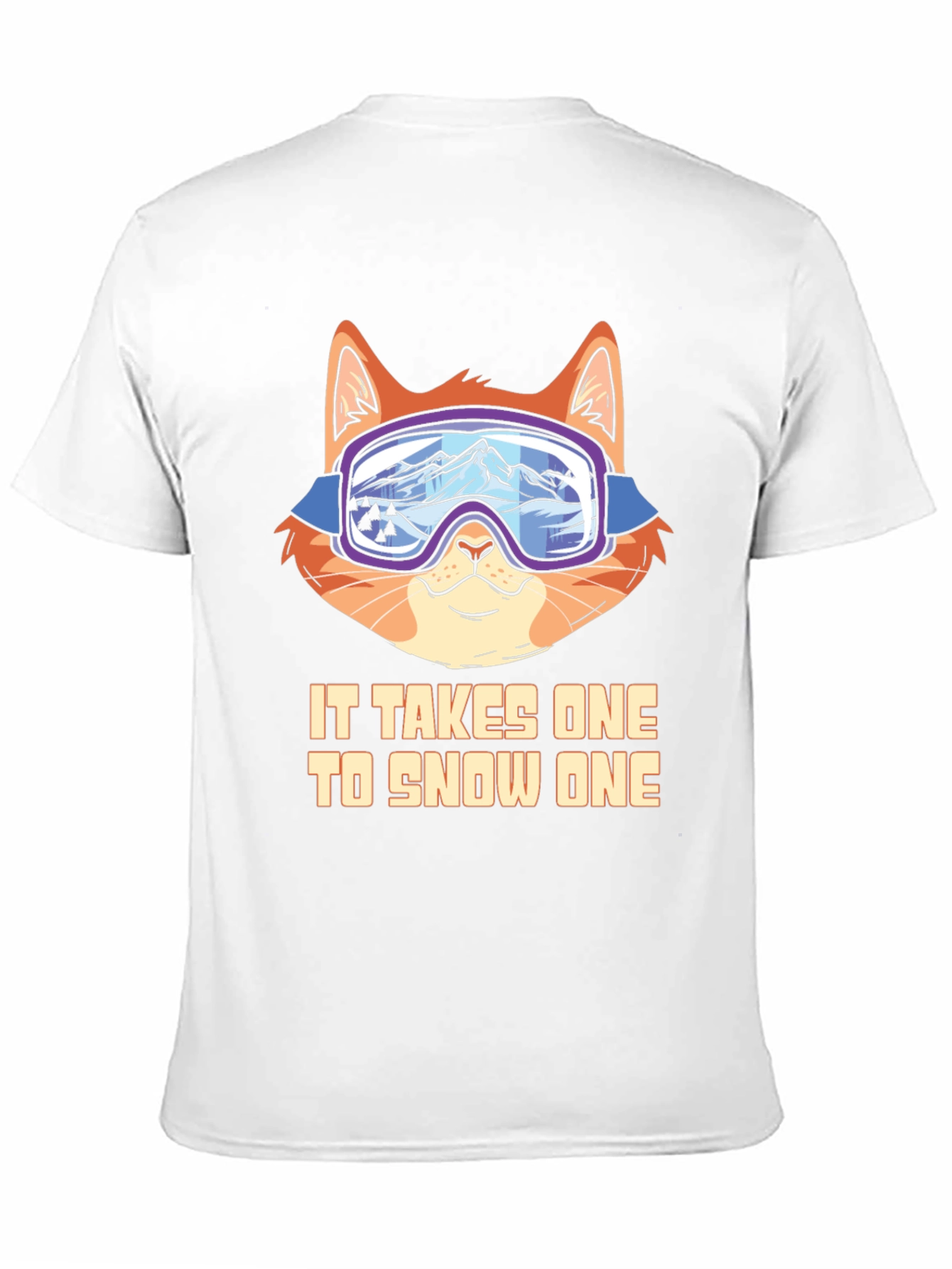 This black t-shirt features a playful design of a cat wearing ski goggles. The graphic showcases a ginger cat with a light orange face, giving it a cute and humorous appeal. The goggles reflect a mountain scene. Below the cat is the phrase "IT TAKES ONE TO SNOW ONE", a clever play on words that is sure to bring a smile. Made from a soft, comfortable fabric, this t-shirt is perfect for casual wear, ski enthusiasts, or anyone who loves unique and funny designs. A great gift idea!