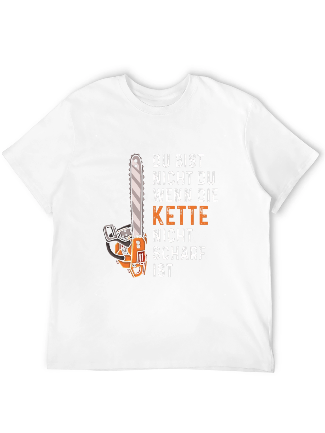 This black t-shirt features a humorous graphic design, perfect for anyone who appreciates a good laugh and a sharp chainsaw. The design incorporates a cartoon image of a chainsaw, paired with the witty German phrase "Du Bist Nicht Du Wenn Die Kette Nicht Scharf Ist," which translates to "You are not you when the chain is not sharp." The text is printed in a mix of white and orange, adding visual interest. Made from a comfortable-looking fabric, this tee is ideal for casual wear. Show off your quirky side with this eye-catching t-shirt, sure to be a conversation starter!