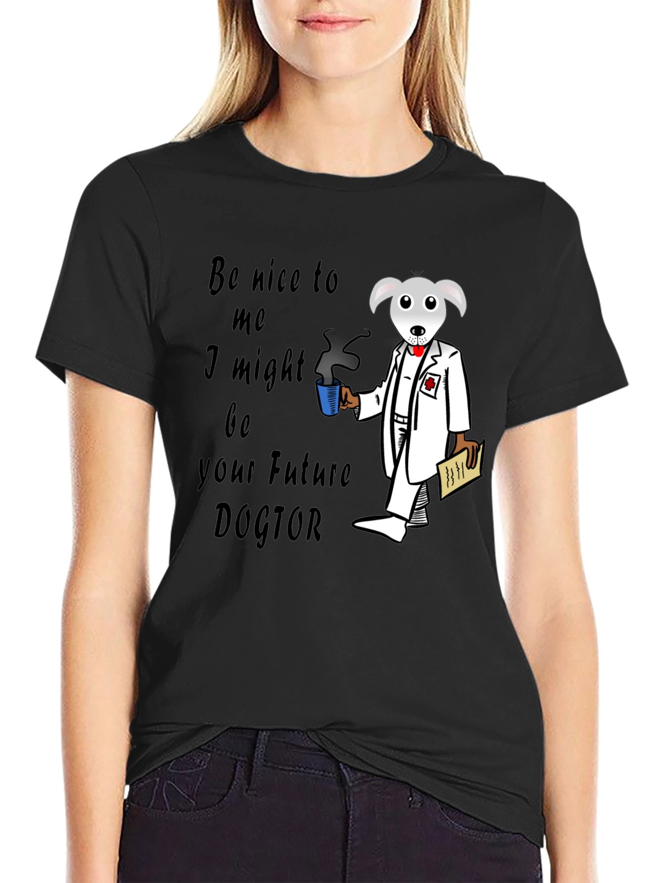 This unique black t-shirt features a whimsical graphic of an anthropomorphic dog dressed as a doctor, holding a cup of coffee and patient records. The design includes the playful phrase "Be nice to me, I might be your Future DOCTOR." Made from a comfortable-looking fabric, this tee is perfect for anyone with a sense of humor, future medical professionals, or dog lovers. Wear it casually, to school, or to social gatherings to spark conversations and showcase your fun personality. It's a great way to express your interests and stand out from the crowd!