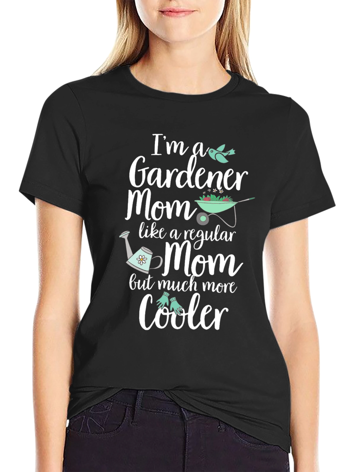 This black t-shirt features a fun, garden-themed design. The graphic includes playful text that reads: "I'm a Gardener Mom like a regular Mom but much more cooler", along with images of a watering can, a wheelbarrow full of flowers, a bird, and gardening gloves. Ideal for casual wear, gardening, or as a thoughtful gift for a gardening enthusiast mother, this shirt is sure to bring smiles and showcase her love for gardening. Its eye-catching design and humorous message make it a unique and charming addition to any wardrobe.