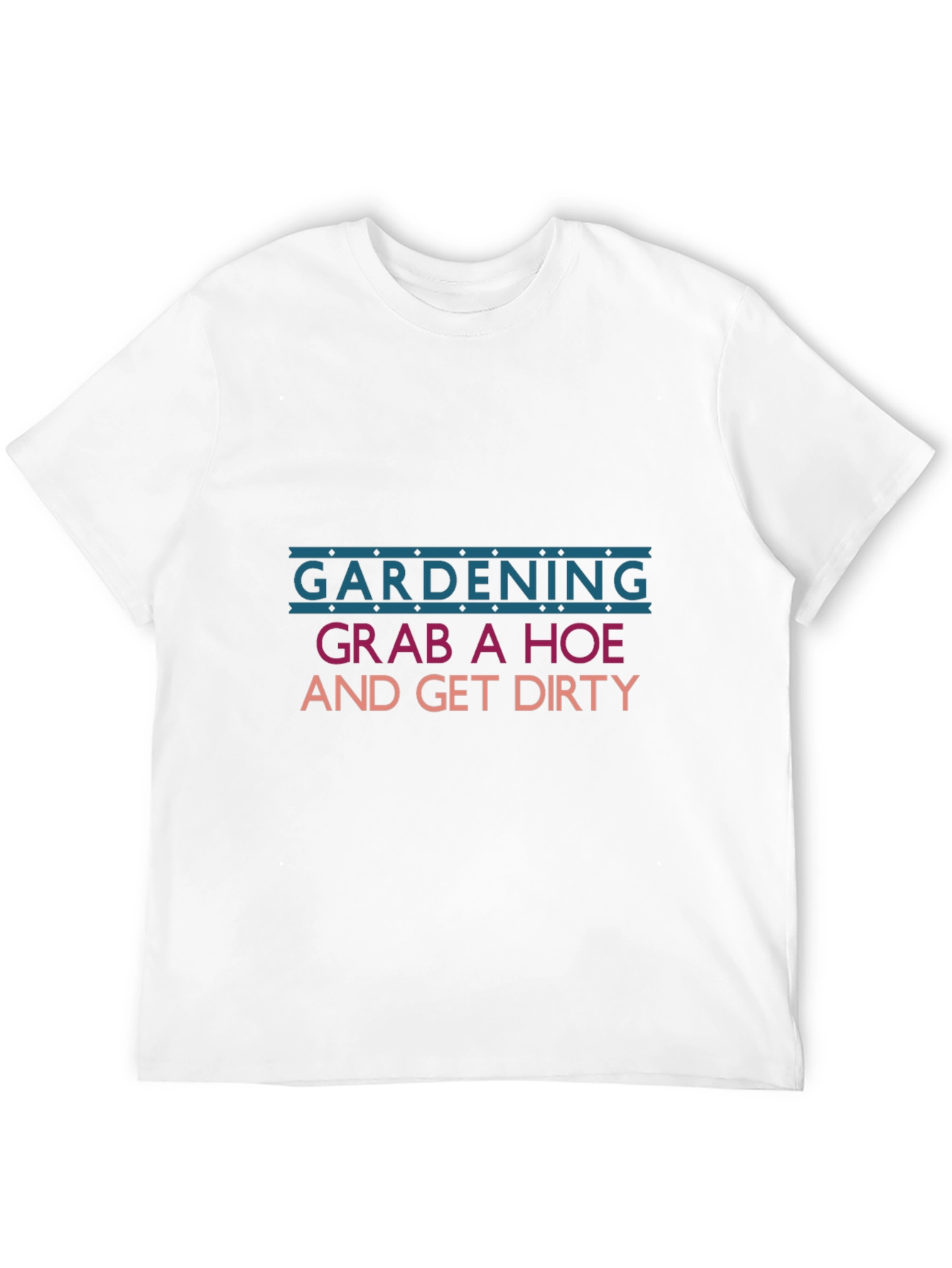 This stylish black t-shirt features a playful gardening-themed design. The graphic includes the words "GARDENING," "GRAB A HOE," and "AND GET DIRTY" in a stacked format with decorative lines above and below the word "GARDENING." The text is displayed in a combination of blue and pink hues, providing a fun and eye-catching contrast against the black background of the shirt. Made from a soft-looking fabric, this casual wear is perfect for any gardening enthusiast with a sense of humor. It’s ideal for wearing while tending to your garden or as a comfortable everyday tee.