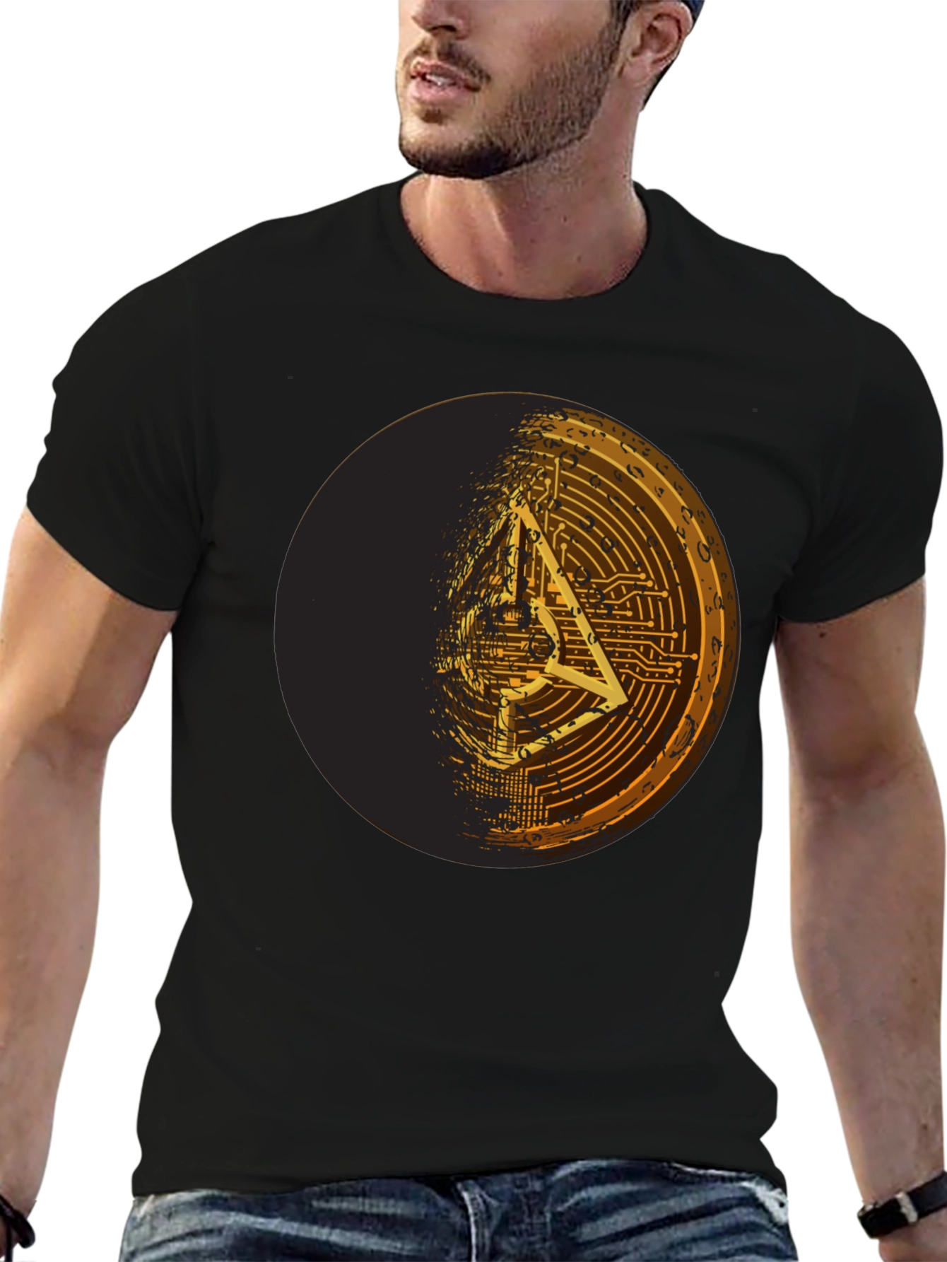 This stylish black t-shirt features a unique geometric circuit design. The graphic, predominantly gold, presents a modern and tech-inspired aesthetic with a blend of structured lines and distressed elements. The circular design is eye-catching and adds a touch of sophistication to the casual black backdrop of the t-shirt. Made from what appears to be soft, comfortable fabric, this t-shirt is ideal for everyday wear. The design is versatile enough to pair with jeans for a relaxed look or dress it up with a jacket for a night out. Perfect for anyone who appreciates modern art, technology, or simply wants to make a statement with their fashion choices.
