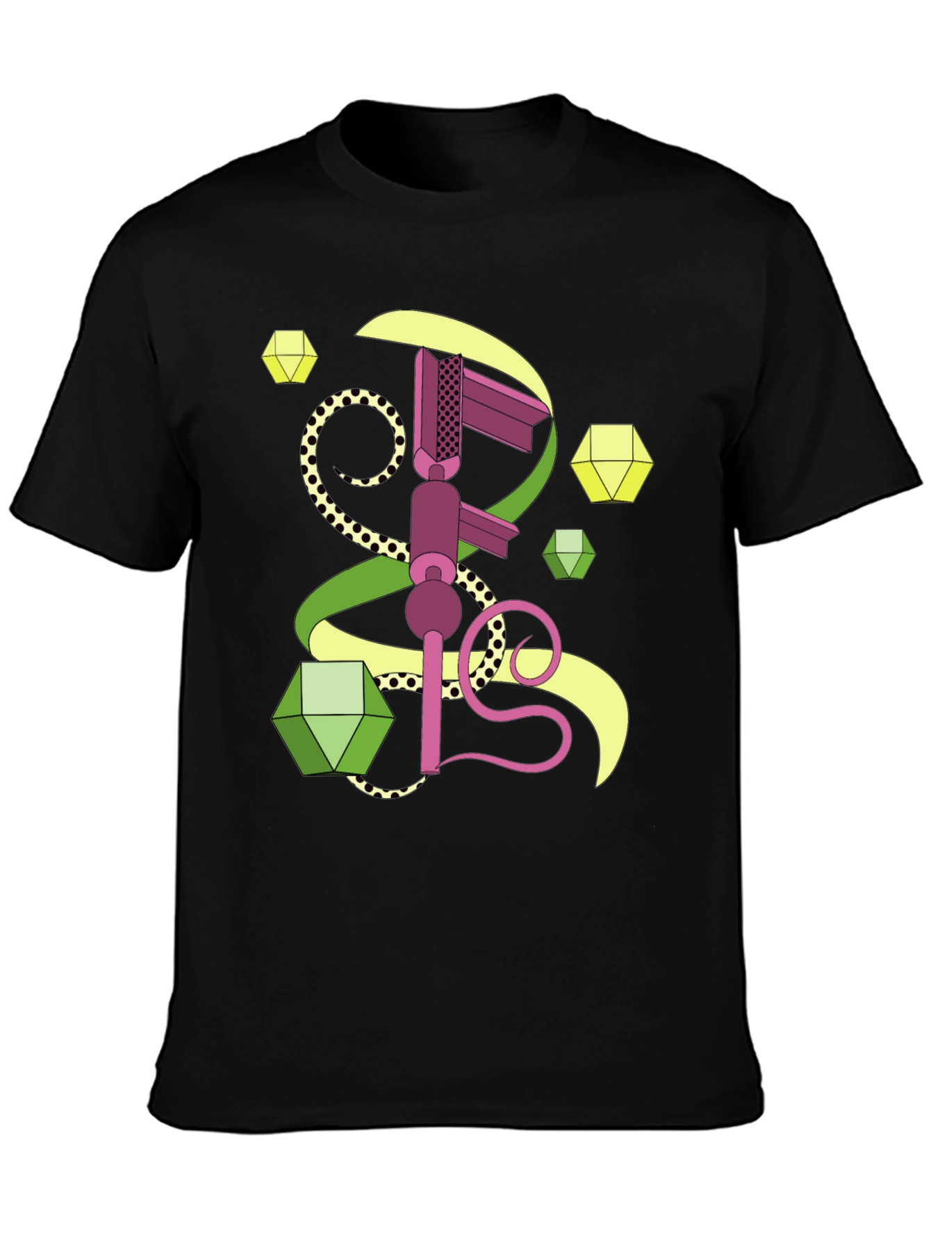 Stand out with this unique black graphic tee. The shirt features an abstract design with a geometric microphone and playful 3D shapes in green, yellow, and pink. Made from soft, breathable fabric, this tee offers both comfort and style. The eye-catching design makes it a conversation starter and a great addition to any casual wardrobe. Perfect for everyday wear, concerts, or expressing your artistic side. Show off your individuality with this trendy and distinctive shirt.