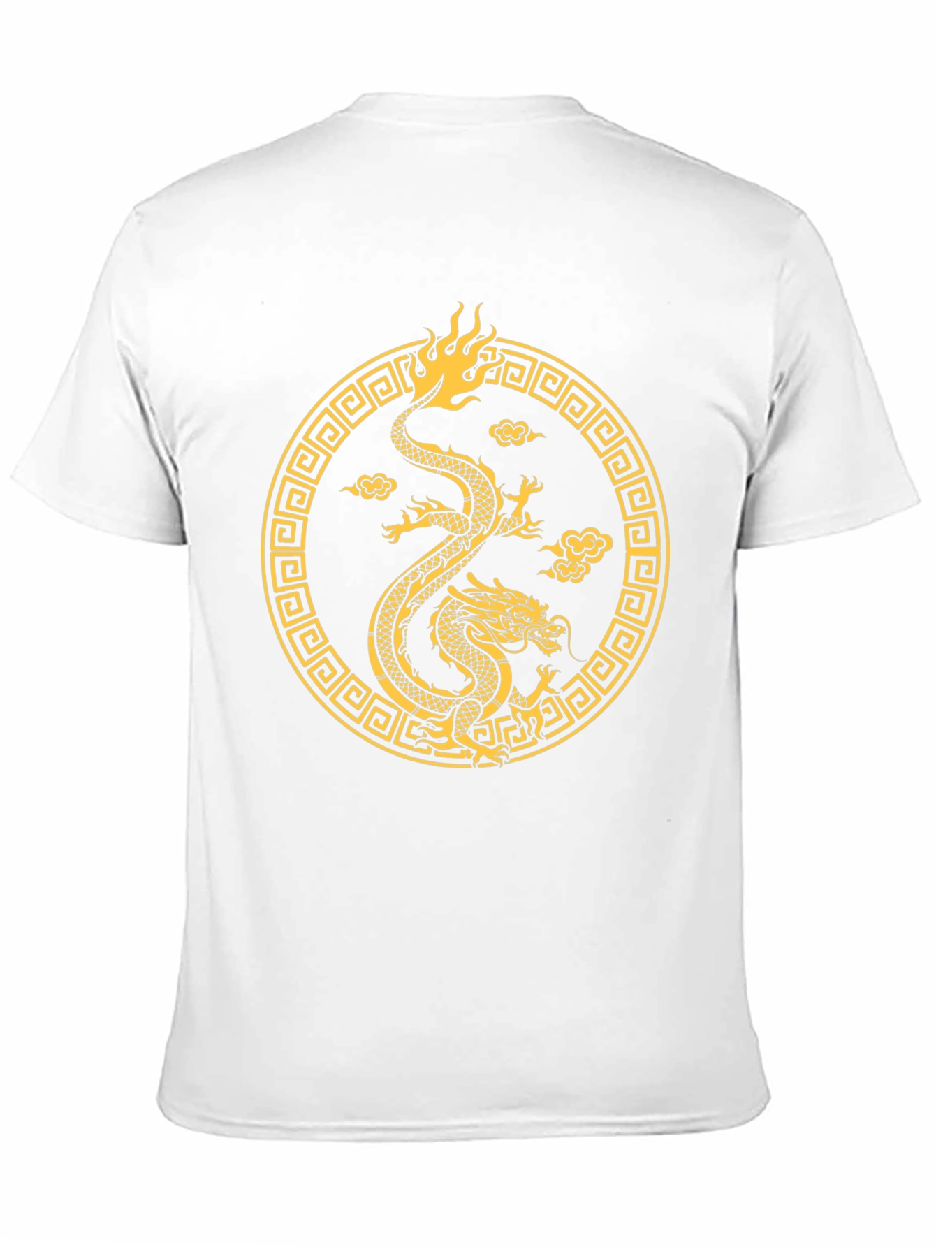 This stylish black t-shirt features a striking golden dragon design encircled by a geometric pattern. The graphic is bold and eye-catching, creating a visually appealing statement piece. The shirt is made from what appears to be a soft and comfortable cotton blend, perfect for everyday wear. The classic crew neck and short sleeves offer a relaxed fit, making it suitable for casual outings or lounging at home. The intricate details of the dragon and the surrounding pattern add a touch of Eastern-inspired flair to your wardrobe. Stand out from the crowd with this unique and fashionable graphic tee. Perfect for those who appreciate mythical creatures and symbolic designs.