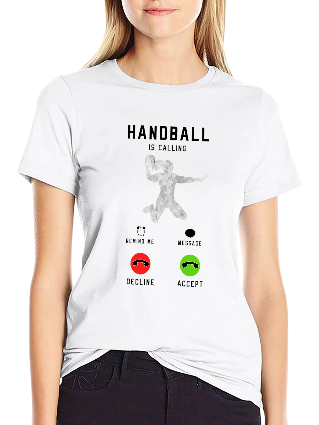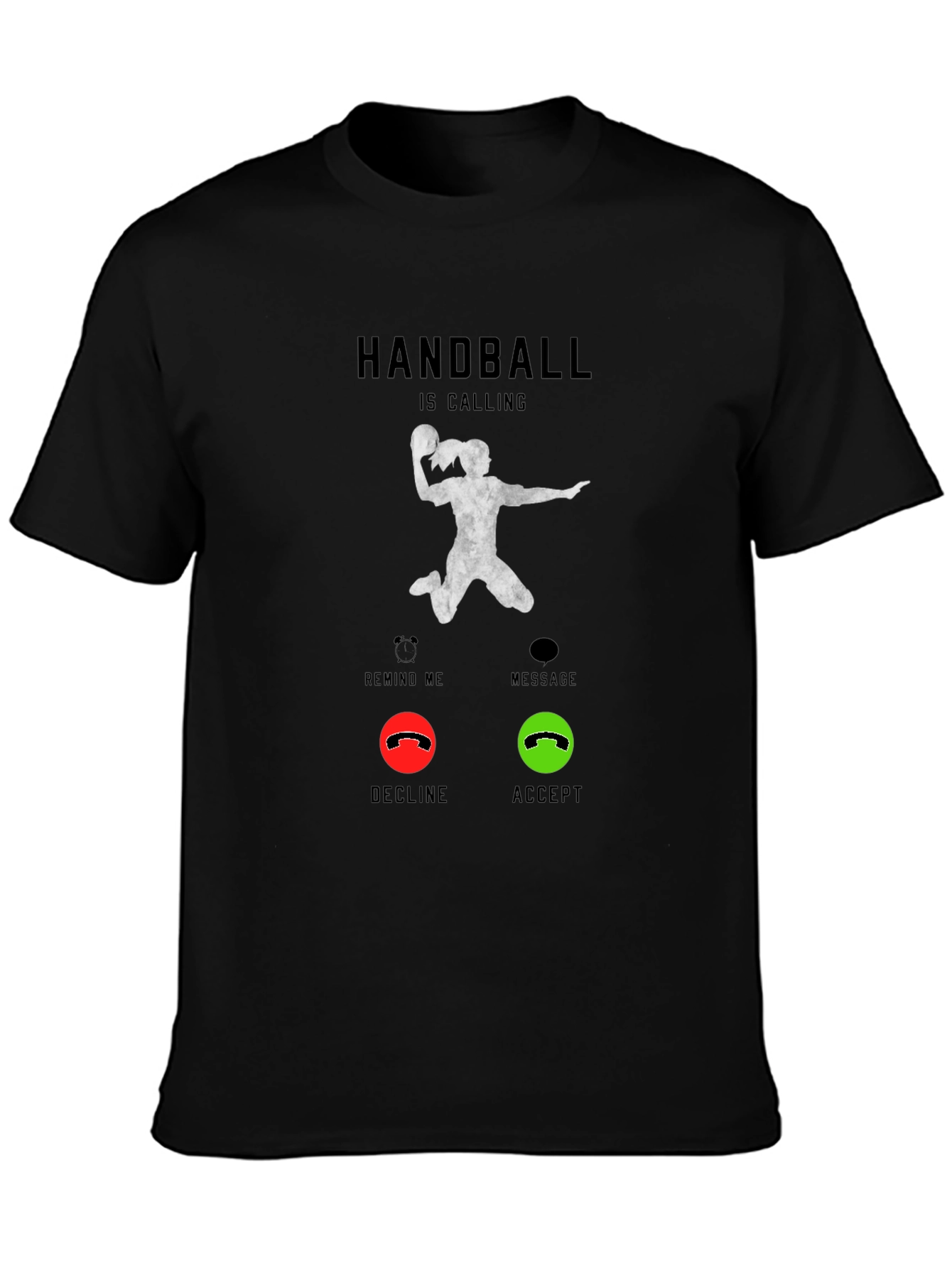 This black t-shirt features a unique design for handball enthusiasts. The graphic displays the text "HANDBALL IS CALLING" above an image of a player in action. Below, there is a simulated incoming call design with "REMIND ME," "MESSAGE," "DECLINE," and "ACCEPT" options, adding a playful twist to the design. Ideal for casual wear or as a gift for a handball player, this shirt allows you to show off your passion for the sport. Made from comfortable fabric, it's perfect for everyday use.