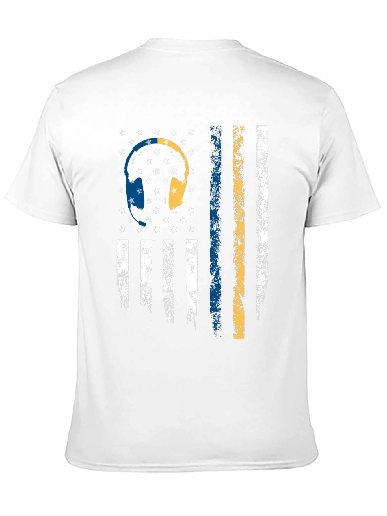 Show off your love for music and patriotism with this unique graphic tee! The black t-shirt features a stylized American flag design with a twist – the stars are complemented by a large headphone graphic. The distressed flag design with vertical stripes in white, blue, and yellow, combined with the iconic headphone silhouette, creates a bold and eye-catching statement. Made from a comfortable, soft fabric, this tee is perfect for everyday wear, music festivals, or casual outings. Pair it with jeans or shorts for a relaxed, trendy look. Get yours today and make a statement!