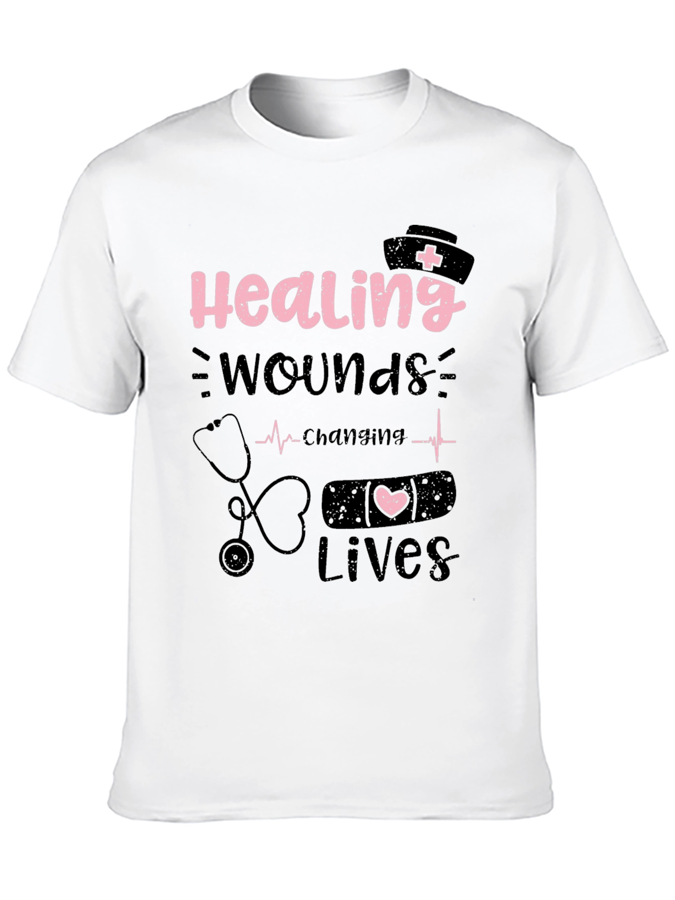 Show your appreciation for nurses with this stylish black t-shirt. Featuring a playful design that reads 'Healing Wounds Changing Lives' alongside medical-themed graphics like a stethoscope, band-aid and nurse cap, this tee is perfect for nurses or anyone who admires them. The soft, breathable fabric ensures all-day comfort, whether you're at work or running errands. The bold lettering and crisp graphics create a standout look that showcases your passion for healthcare. A thoughtful gift or a fun addition to your own wardrobe, this t-shirt blends fashion and functionality effortlessly.