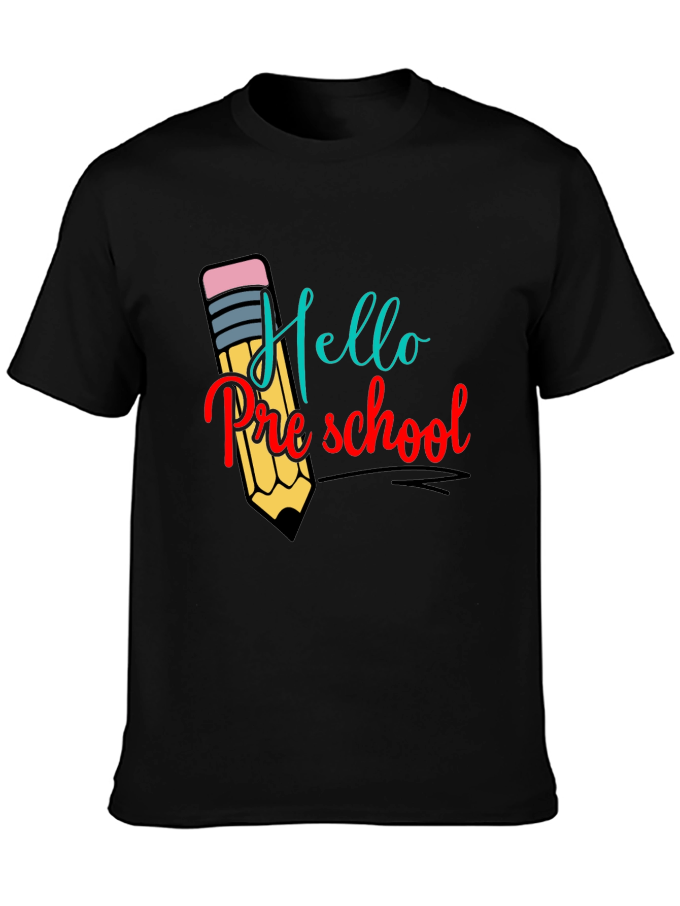 This black t-shirt features a vibrant and playful design perfect for educators or anyone celebrating the preschool experience. A colorful graphic of a pencil is incorporated alongside the words "Hello Preschool" in a stylish, eye-catching font. The design creates a fun and welcoming vibe, ideal for wearing to school, casual outings, or educational events. The shirt appears to be made from comfortable, breathable fabric, ensuring all-day comfort. Its versatile style makes it easy to pair with jeans, shorts, or skirts. Show your love for preschool with this cheerful and expressive tee!