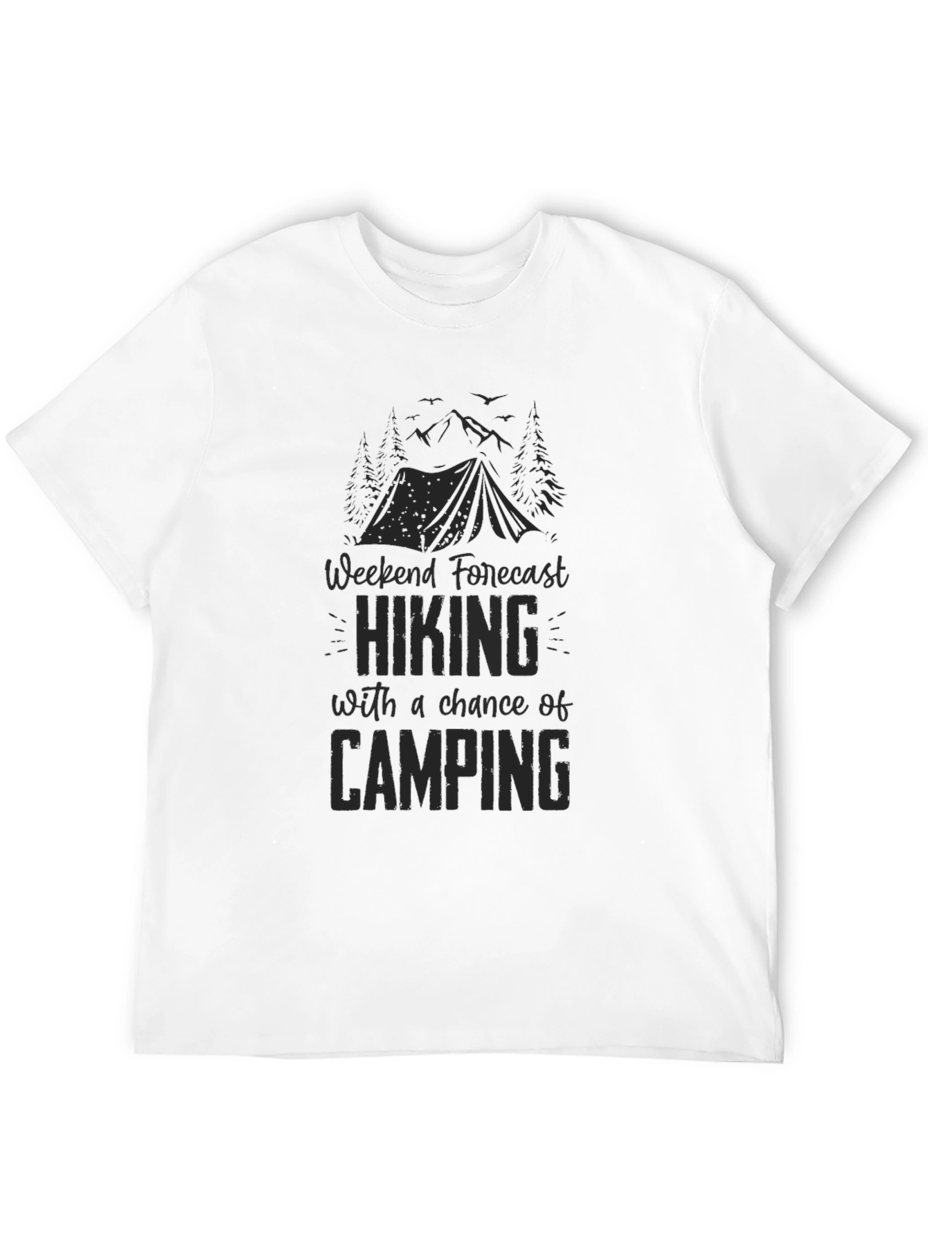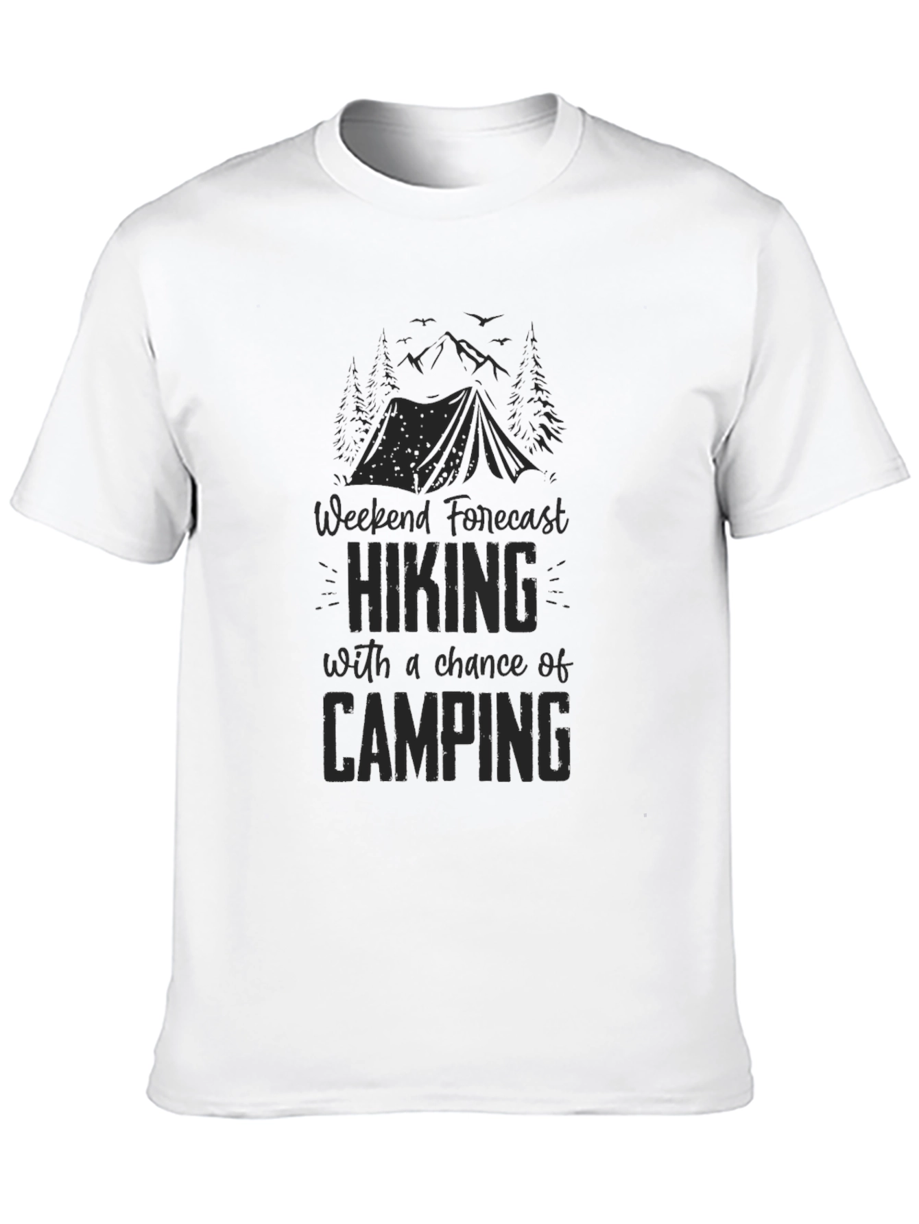 Embrace your love for the great outdoors with this stylish black graphic t-shirt! Featuring a clever "Weekend Forecast: Hiking with a chance of Camping" design, complete with a subtle tent and mountain graphic. This tee is perfect for adventurers and nature enthusiasts. Its relaxed fit and soft fabric ensure all-day comfort, whether you're hitting the trails or relaxing by the campfire. Show off your passion for the outdoors with this eye-catching and comfortable t-shirt. Ideal for casual wear or as a gift for the hiking and camping lover in your life.