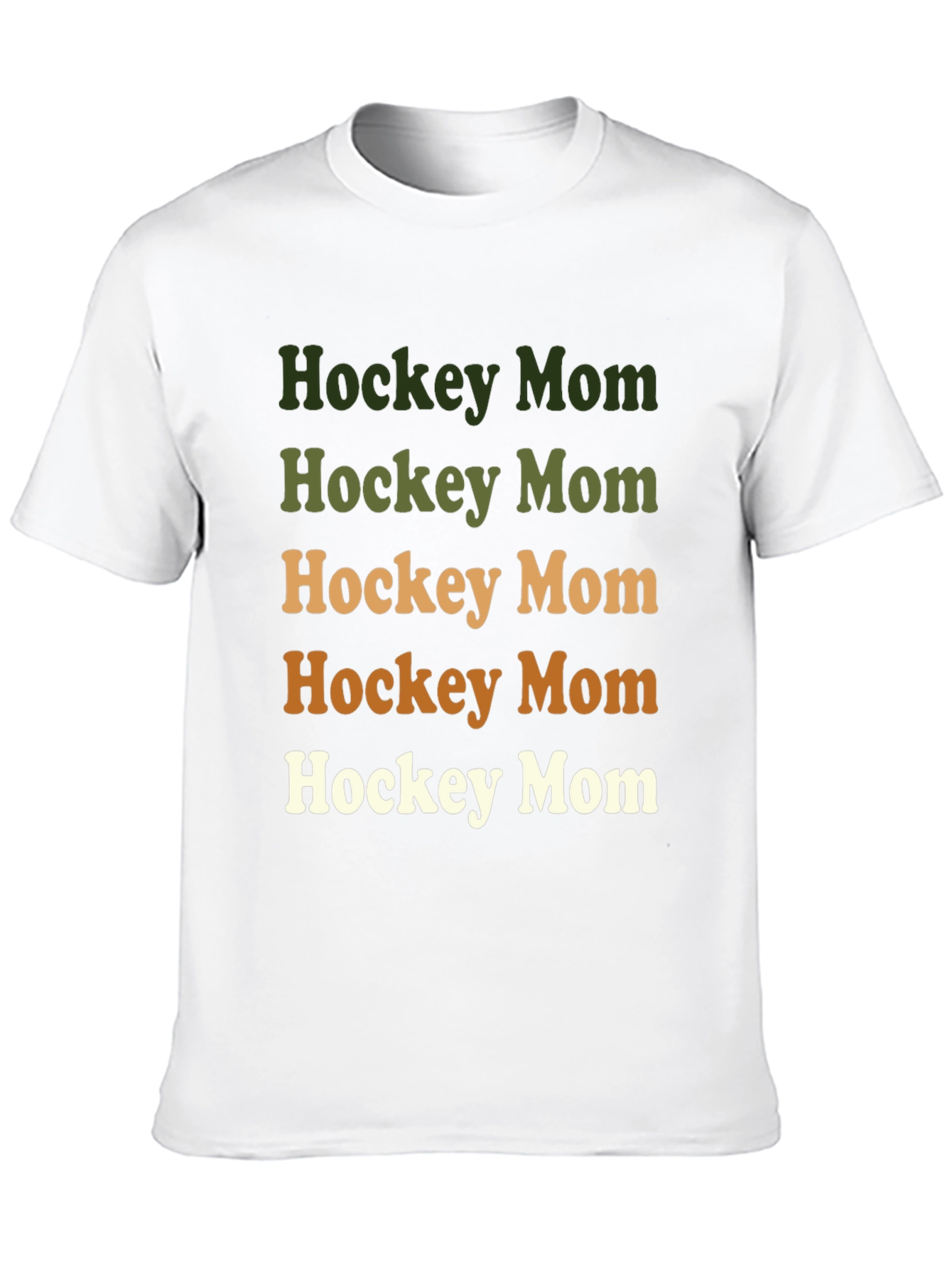 Show your hockey pride with this stylish "Hockey Mom" graphic tee. Made from a comfortable, dark-colored fabric, this tee features the phrase "Hockey Mom" repeated in varying shades of green and orange. The design offers a vintage-inspired vibe, perfect for casual outings, game days, or everyday wear. It's an ideal way to express your support and passion for hockey while staying fashionable. A great gift for hockey moms!