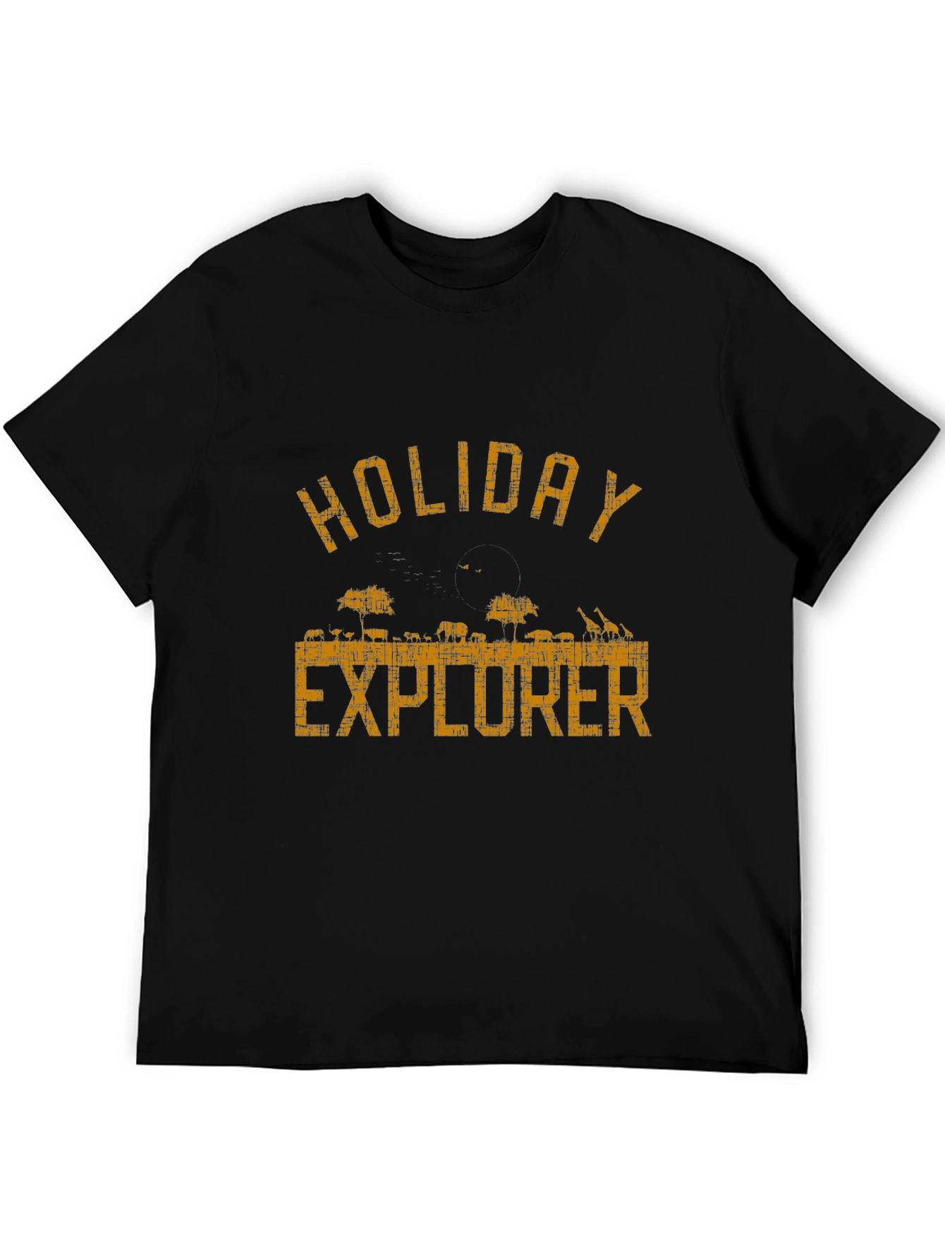Embark on a style safari with this unique graphic tee. Featuring a bold 'Holiday Explorer' print over a silhouette of African wildlife, this shirt is perfect for travel enthusiasts and nature lovers. The design showcases elephants, giraffes, and acacia trees in a vintage-inspired, distressed yellow color, creating a worn, adventurous look. Made from a soft, breathable fabric, it offers all-day comfort whether you're exploring a new city or relaxing at home. Pair it with jeans or shorts for a casual, stylish outfit. Ideal for vacations, weekend getaways, or everyday wear, this tee adds a touch of wanderlust to your wardrobe. Let your shirt tell your story of exploration and adventure!