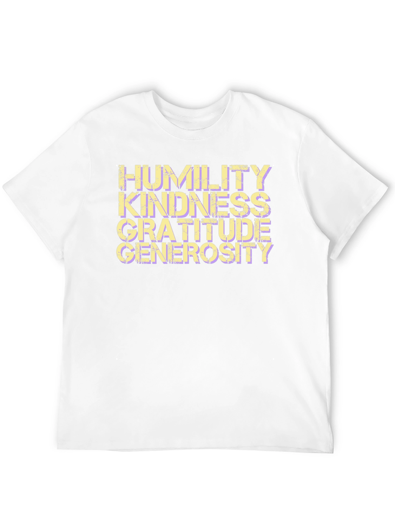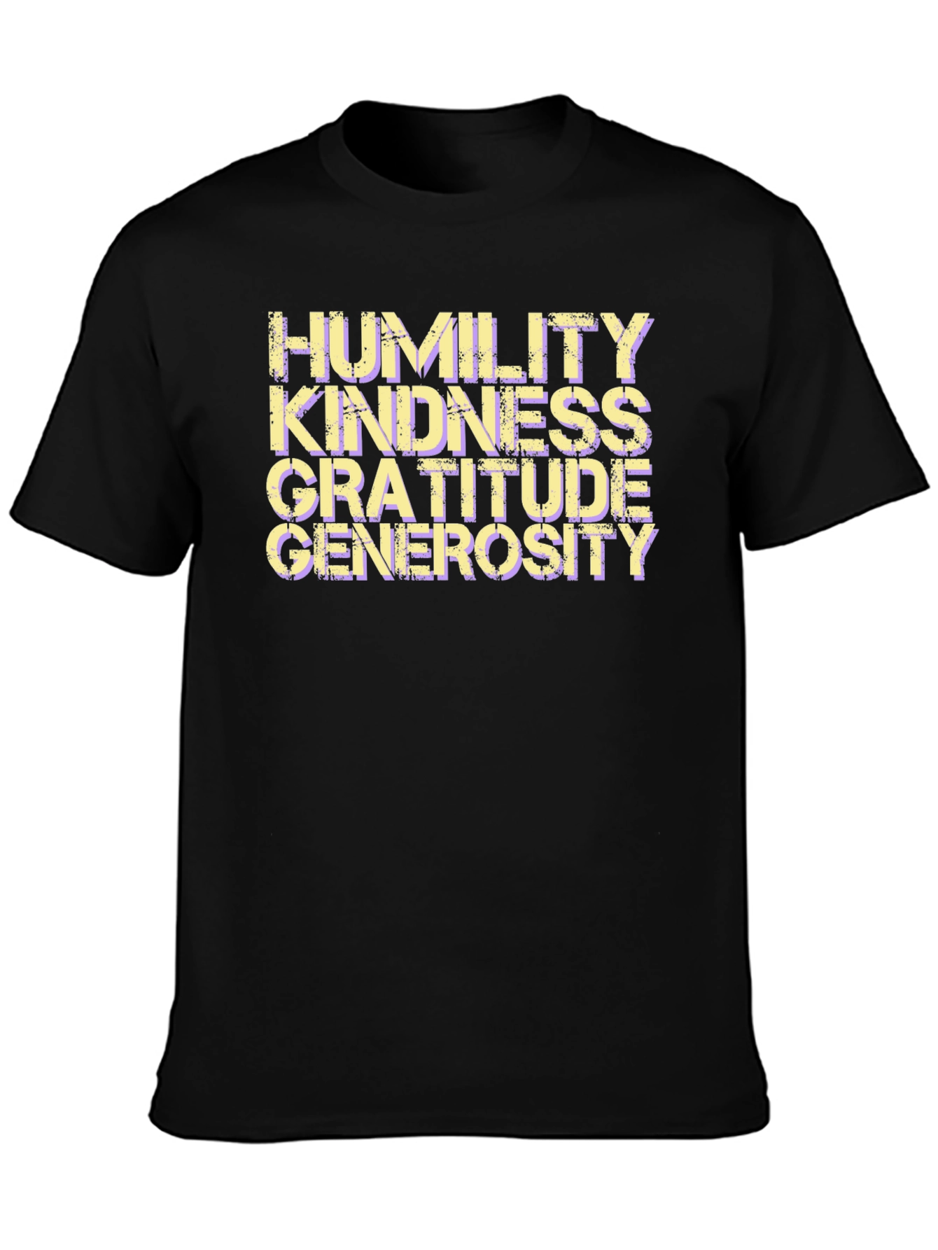 This stylish black t-shirt features an impactful message of positivity. The words Humility, Kindness, Gratitude, and Generosity are stacked vertically in a bold, slightly distressed font that adds character. The design is eye-catching and promotes virtues, making it perfect for everyday wear. Made from what appears to be a comfortable and durable fabric, this tee is ideal for casual outings, inspirational events, or as a thoughtful gift. Show off your positive values with this unique and meaningful piece!