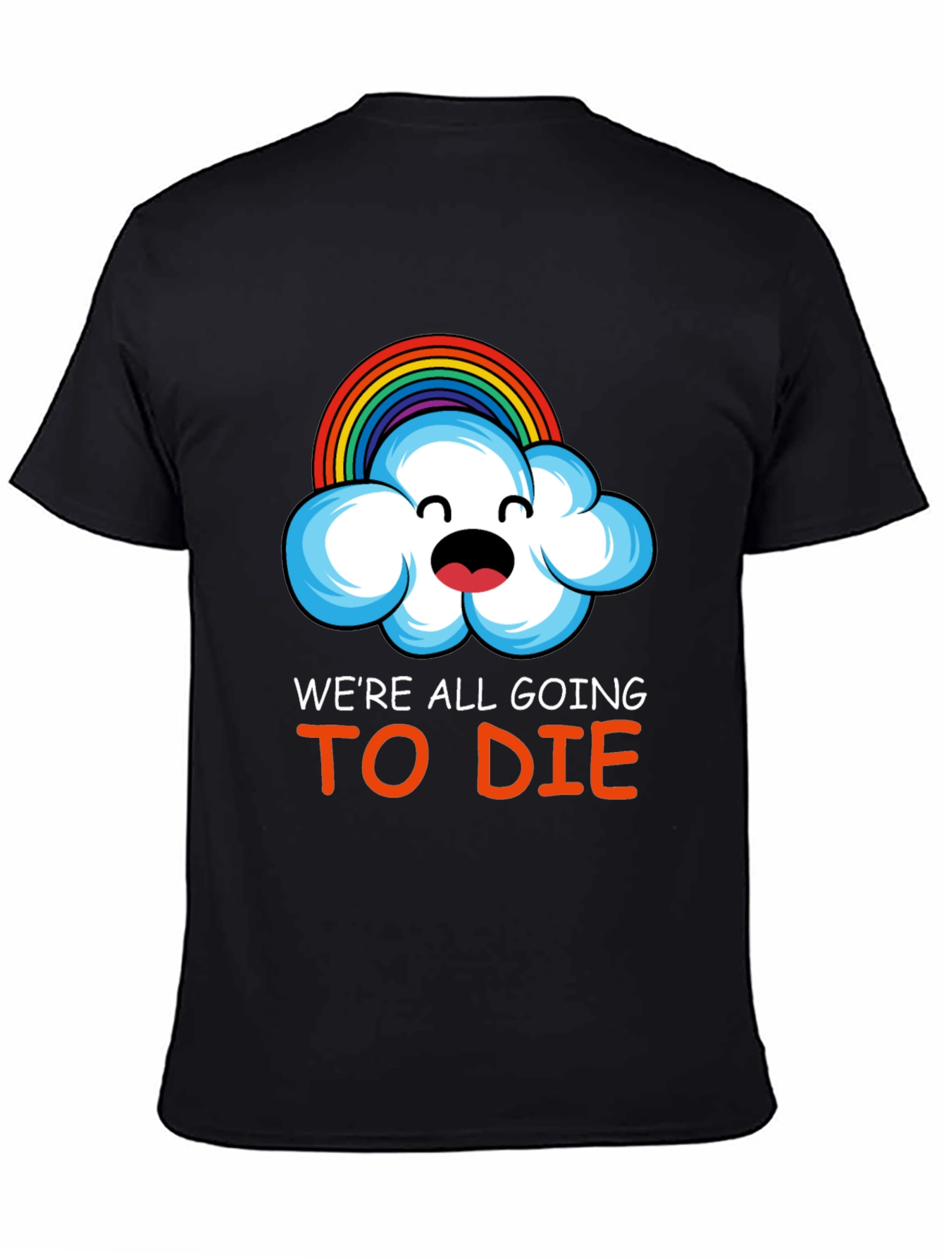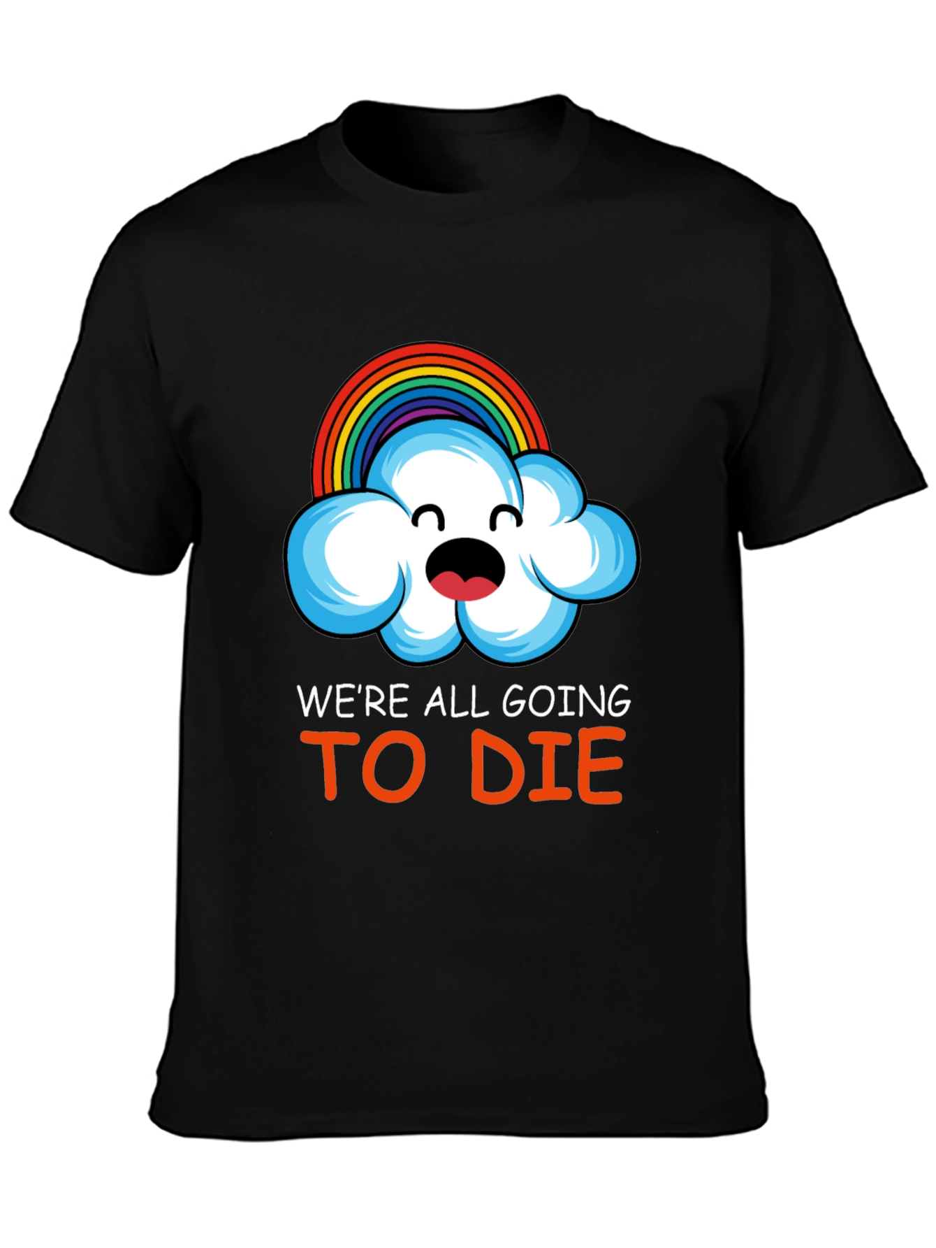 Add a touch of dark humor to your wardrobe with this eye-catching black T-shirt. The design features a cheerful rainbow and cloud graphic with the words "WE'RE ALL GOING TO DIE" printed in bold, orange lettering. Made from what appears to be comfortable cotton blend fabric, this tee offers both style and comfort. The graphic is vibrant and durable, ensuring it will last wash after wash. Ideal for casual wear, parties, or as a unique gift for those with a witty sense of humor. Make a statement and spark conversations with this memorable T-shirt.