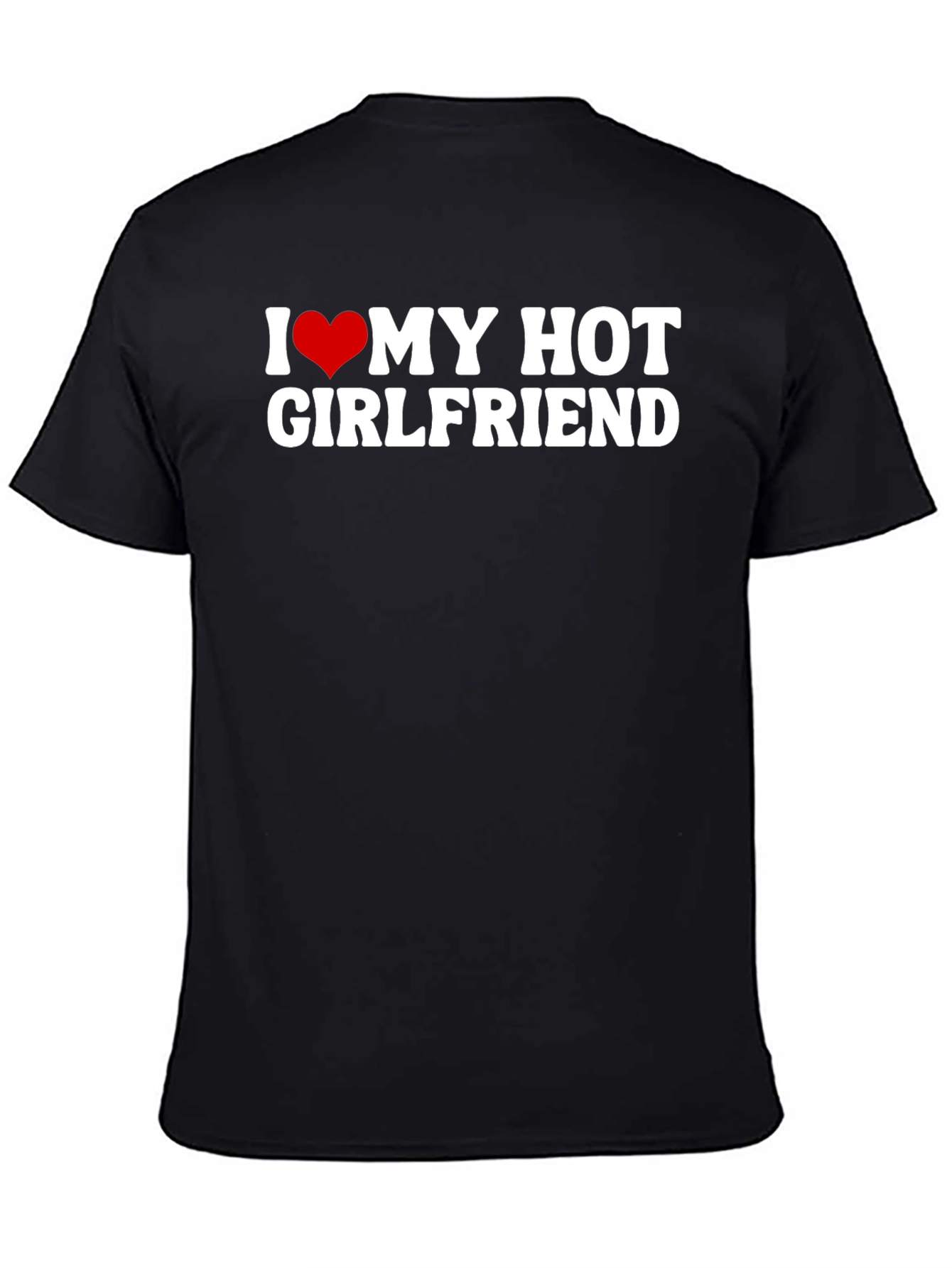 Declare your affection with this bold black t-shirt. The design features the phrase 'I [heart symbol] MY HOT GIRLFRIEND' in a crisp white font, making a statement. Made from what appears to be soft, comfortable fabric, this short-sleeved tee is perfect for casual wear. Show off your love for your significant other with this eye-catching garment. Ideal for everyday wear, parties, or as a fun gift for the proud boyfriend.