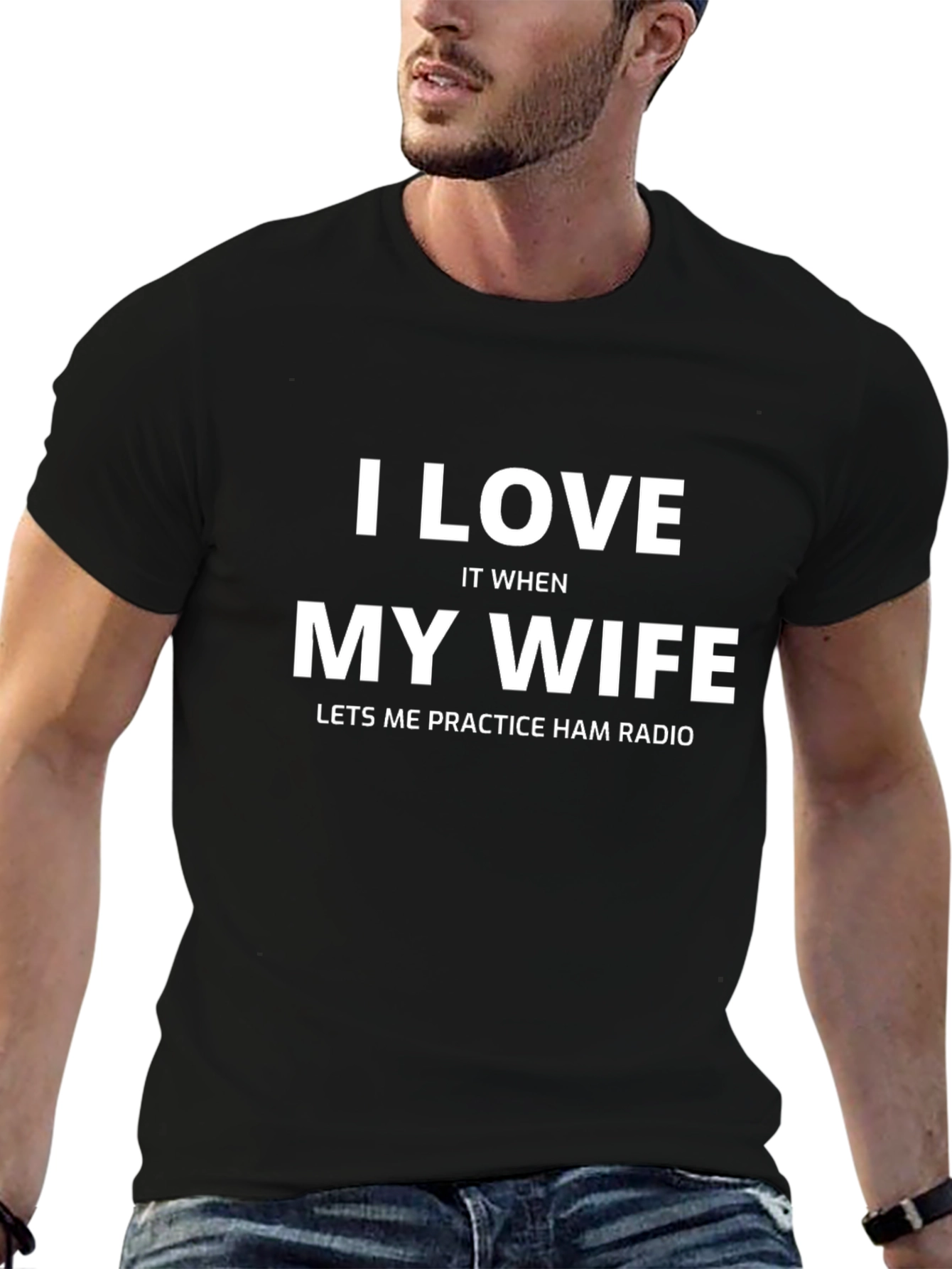 Show your love for your wife and ham radio with this stylish black t-shirt! The shirt features a bold, white text design that reads "I LOVE IT WHEN MY WIFE LETS ME PRACTICE HAM RADIO." Made from comfortable, breathable fabric, this tee is perfect for casual wear, ham radio events, or just lounging around the house. This t-shirt makes a humorous gift for any ham radio enthusiast with a supportive wife. Get yours today and let everyone know how much you appreciate her!