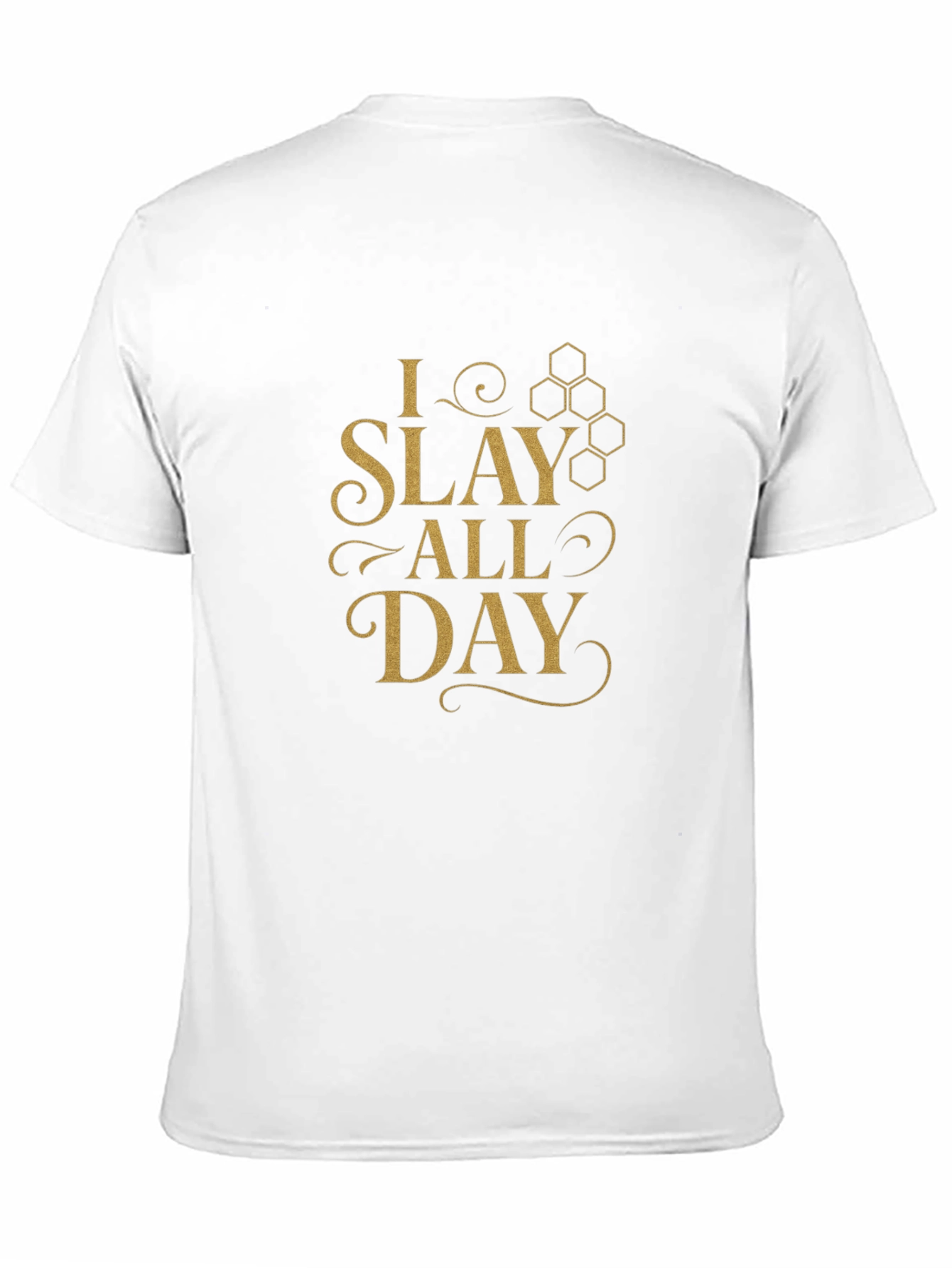 Show off your confidence with this stylish black graphic tee! The shirt features a bold "I SLAY ALL DAY" design in an elegant gold font, complete with honeycomb accents for a touch of sweetness. Made from a comfortable, breathable fabric, this tee is perfect for everyday wear. Whether you're hitting the town, running errands, or just lounging at home, this shirt will keep you looking and feeling great. Pair it with jeans, shorts, or a skirt for a versatile and fashionable look that slays, all day long!