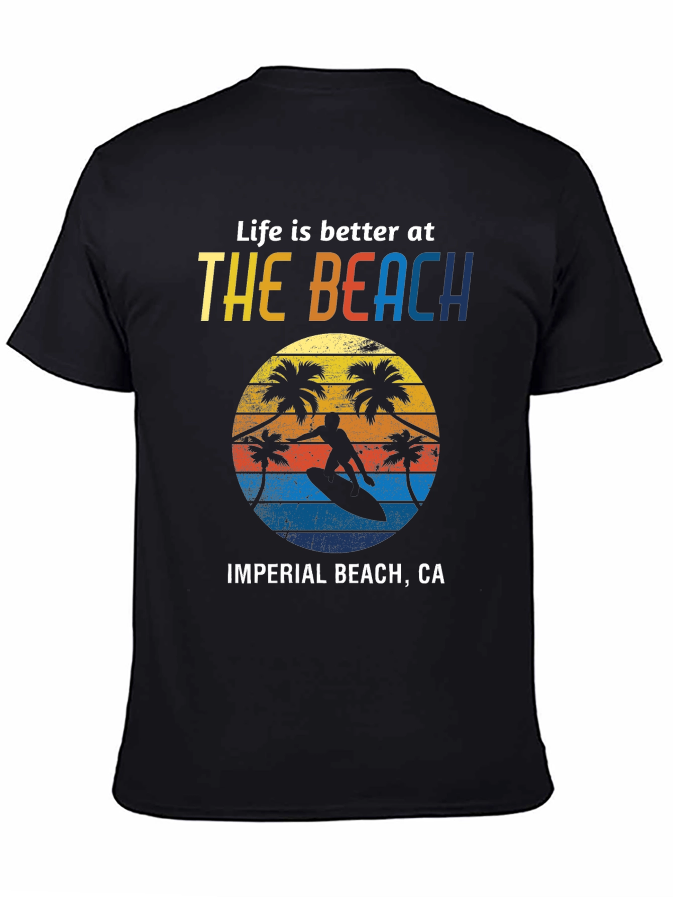 Embrace the beach life with this stylish black T-shirt! Featuring a vibrant graphic design with the text "Life is better at THE BEACH", it also depicts a surfer riding a wave under palm trees at sunset. The shirt is branded with "IMPERIAL BEACH, CA" adding a touch of local flavor. Perfect for casual wear, beach outings, or as a souvenir, this comfortable T-shirt is ideal for anyone who loves the ocean. Show off your love for Imperial Beach in style!