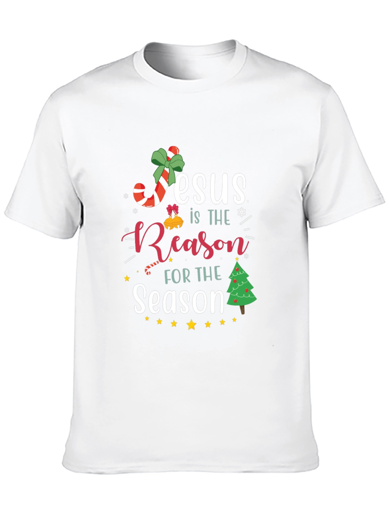 Spread holiday cheer with this festive black T-shirt! The design features the phrase "Jesus is the Reason for the Season", creatively arranged with candy cane accents, a cute Christmas tree, and decorative stars and snowflakes. The vibrant colors and playful typography make it a standout piece for Christmas gatherings, church events, or casual holiday outings. Made from comfortable fabric, this T-shirt is perfect for celebrating the true meaning of Christmas in style. A great way to express your faith and add a touch of holiday spirit to your wardrobe!