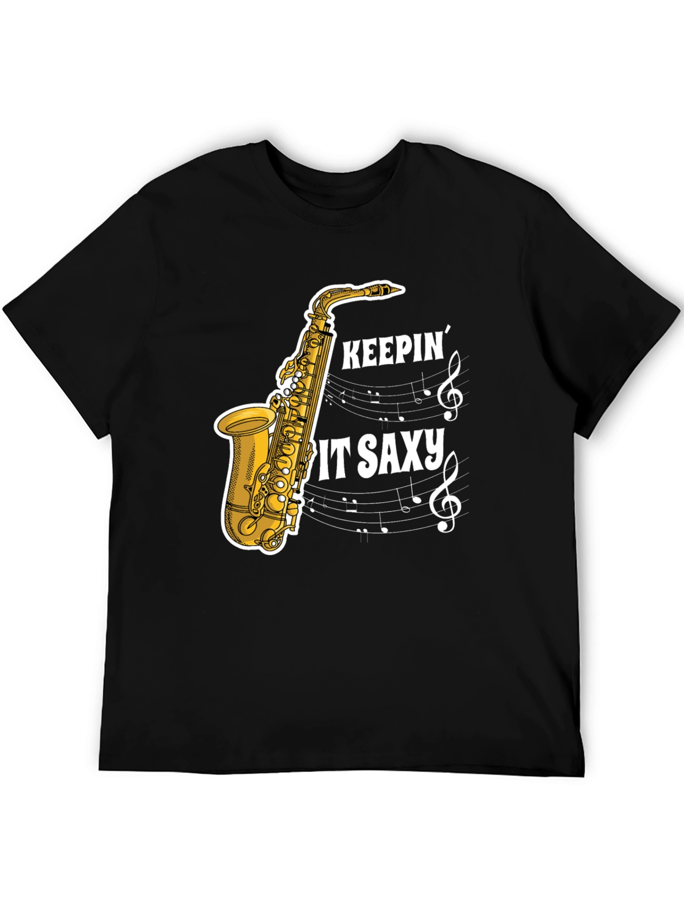 Show off your love for music with this eye-catching graphic t-shirt. This black tee features a vibrant, detailed illustration of a saxophone alongside musical notes and the playful text "Keepin' it Saxy." Made from a soft and comfortable fabric, this shirt is perfect for casual wear, music events, or as a gift for the saxophonist in your life. The bold design ensures you'll stand out from the crowd, while the classic fit provides all-day comfort. Whether you're a musician or simply appreciate great music, this t-shirt is a stylish way to express your passion.