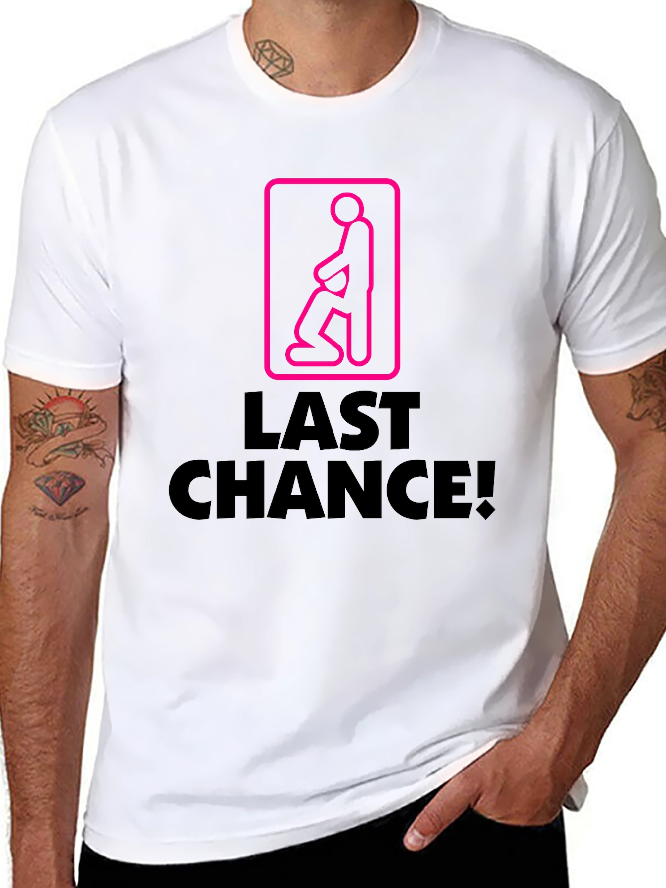 This black novelty t-shirt features a humorous and eye-catching design. A pink rectangular graphic with a stick figure. Below is the phrase "LAST CHANCE!" in bold, black letters. Crafted from a soft, comfortable fabric, this tee is perfect for casual wear and guaranteed to spark conversation. Wear it to bachelor parties, casual outings, or anywhere you want to make a statement. Its bold and playful design is sure to turn heads and add a touch of humor to your wardrobe. A fun and unique addition to any closet.