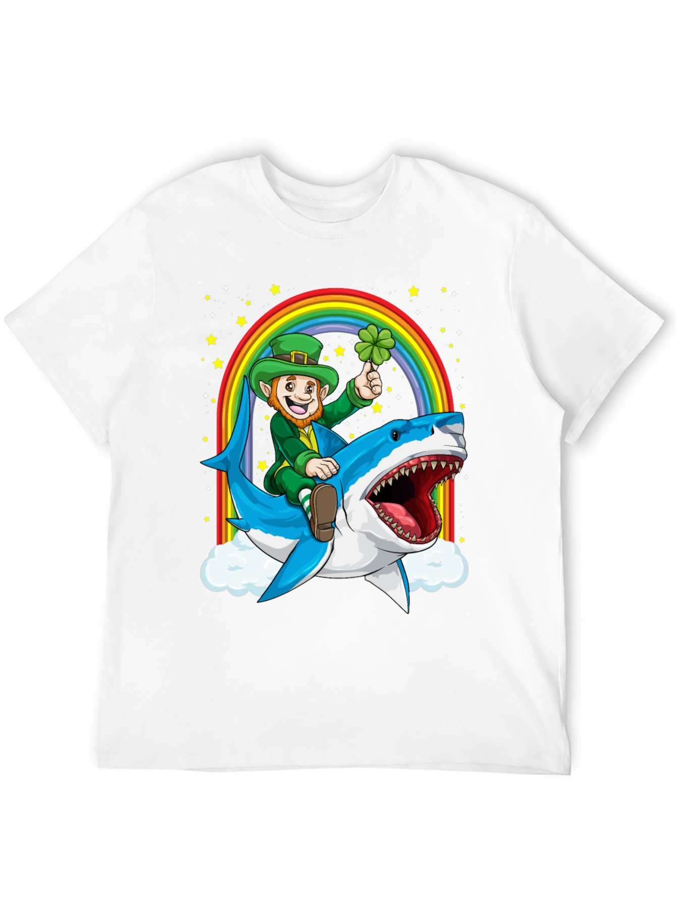 Show off your St. Patrick's Day spirit with this unique t-shirt! The black tee features a vibrant graphic of a leprechaun riding a blue shark, complete with a rainbow and twinkling stars in the background. The leprechaun, adorned in a green hat and suit, holds a lucky four-leaf clover. Made from comfortable materials, this short-sleeve shirt is ideal for casual wear or festive celebrations. Get ready to turn heads and spread some Irish cheer with this eye-catching and whimsical design, perfect for any St. Paddy's Day gathering or a fun everyday look.