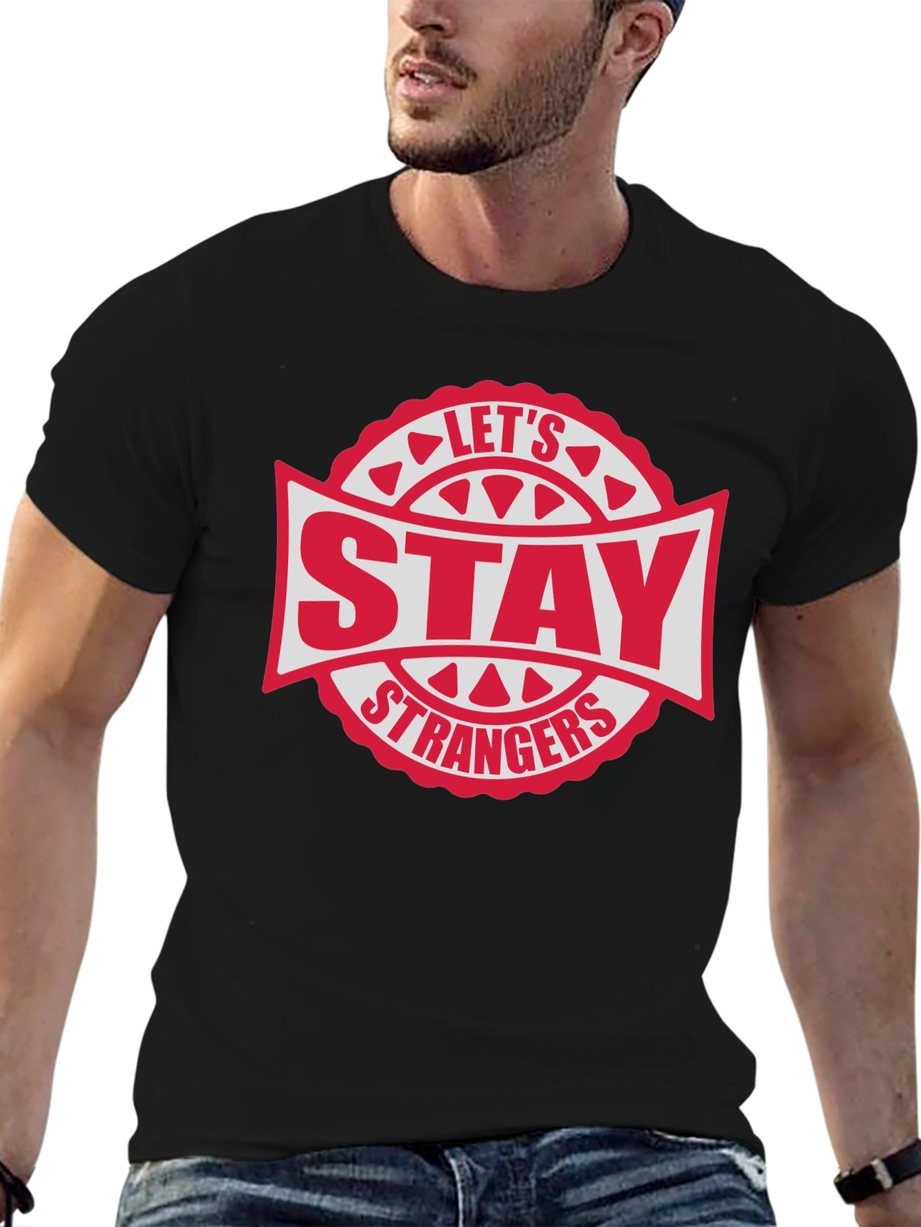 Embrace a unique vibe with this stylish black t-shirt featuring a bold "Let's Stay Strangers" graphic. The design showcases a retro-inspired logo in red and white, adding a pop of color to the dark background. Made from a soft, breathable fabric, this shirt offers both comfort and a fashionable edge. Perfect for casual outings, concerts, or simply expressing your individuality. Pair it with jeans or shorts for a relaxed yet eye-catching look. A must-have for anyone who appreciates edgy fashion!