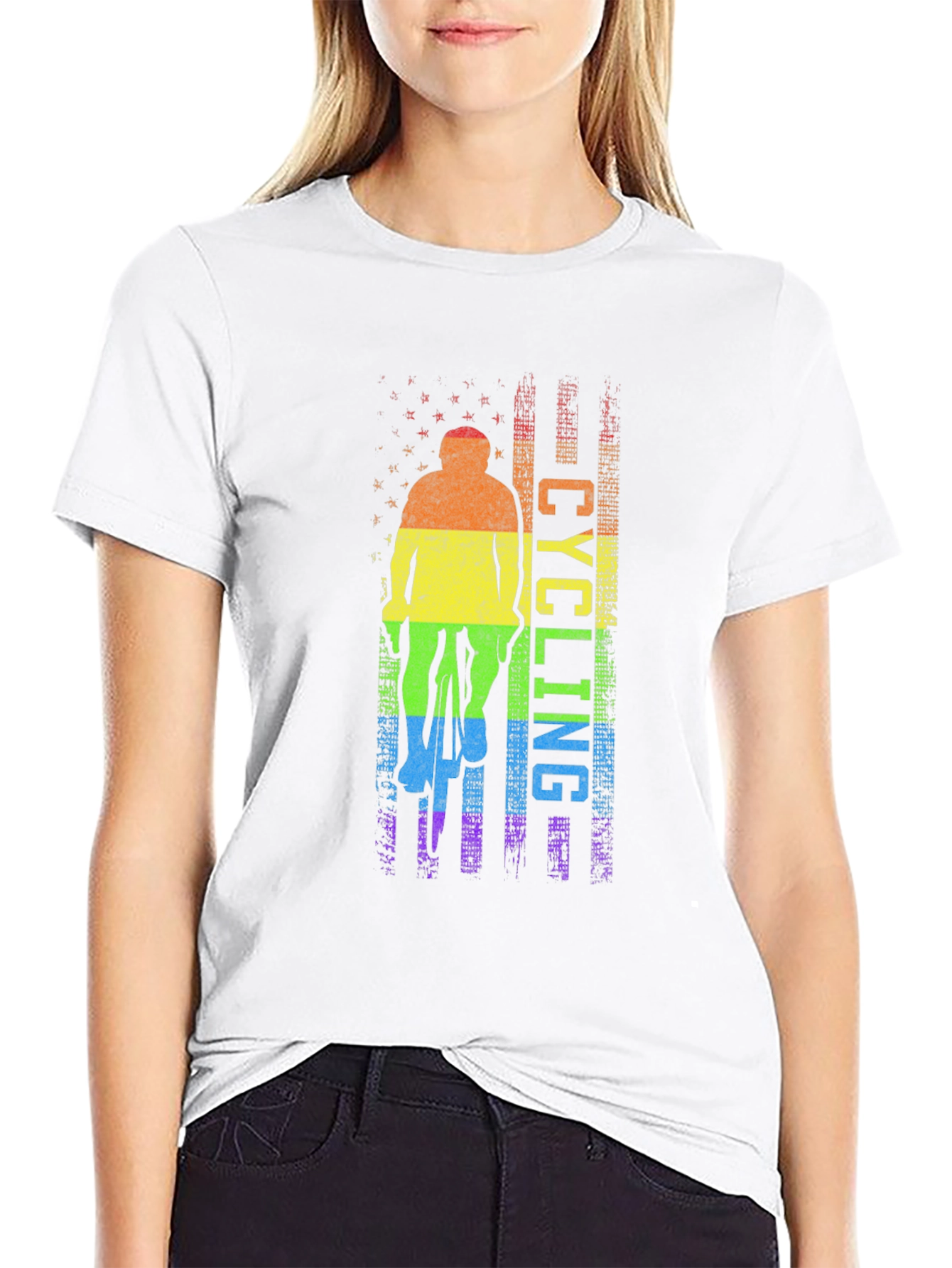 Show your pride and passion for cycling with this unique black T-shirt. The shirt features a striking rainbow-colored silhouette of a cyclist, overlaid with the word "CYCLING" in bold, vertically stacked letters. The vibrant colors and distressed design create a vintage, eye-catching look. Made from a comfortable, breathable fabric, this T-shirt is perfect for casual wear or as a statement piece during cycling events and pride celebrations. The classic fit makes it a great choice for both men and women who want to express their individuality and support for the LGBTQ+ community. Wear your pride on your sleeve (or chest!) with this stylish and meaningful T-shirt.