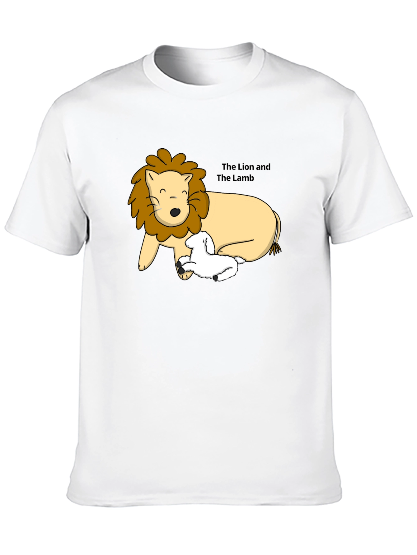 Show off your unique style with this striking black cotton t-shirt. The design features a cartoon-style illustration of a lion and lamb, side-by-side, with the words "The Lion and The Lamb" subtly placed above. This tee offers both comfort and style, making it a great addition to any casual wardrobe. Wear it to express your individuality, spark conversations, or simply enjoy a comfortable day out. The bold graphic stands out against the classic black backdrop, making it versatile enough to pair with jeans, shorts, or even a skirt. A must-have for those who appreciate distinctive designs and quality apparel.