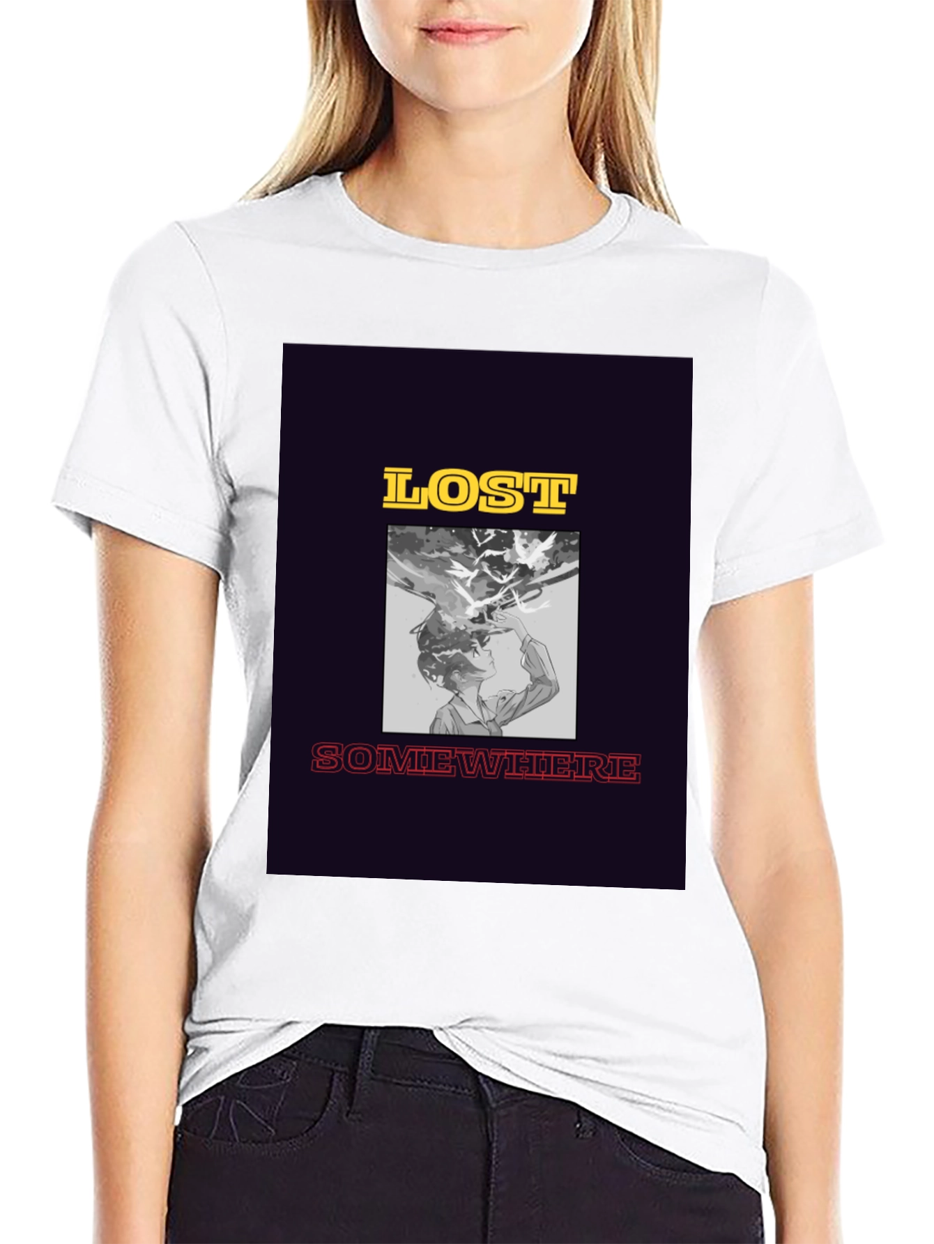 This black t-shirt features a unique graphic design with the word 'LOST' printed above an artistic monochrome image. Below the image, the word 'SOMEWHERE' completes the message. The print has a distinctive visual style, making it a standout piece. Made from comfortable, breathable fabric, this tee is perfect for casual wear. Pair it with jeans or shorts for a relaxed, stylish look. Show off your individuality with this eye-catching t-shirt, suitable for everyday wear or as a conversation starter. The design adds an edgy vibe to any outfit.