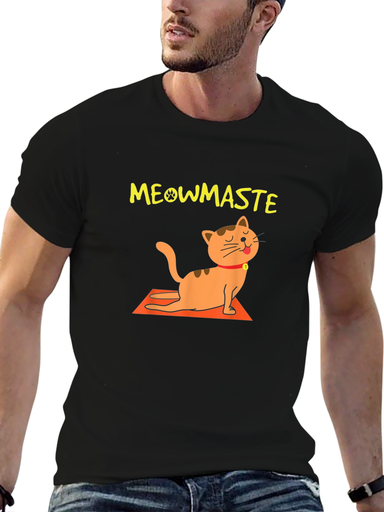 This unique black t-shirt features a playful "Meowmaste" design, perfect for yoga enthusiasts and cat lovers alike! The vibrant yellow text and adorable orange cat illustration add a fun, whimsical touch to your wardrobe. The cat is depicted in a yoga pose on an orange mat. Made from a soft, comfortable fabric, this short-sleeved tee is ideal for casual wear, yoga sessions, or lounging at home. Show off your love for feline friends and inner peace with this eye-catching and conversation-starting t-shirt! A must-have for any cat-loving yogi.