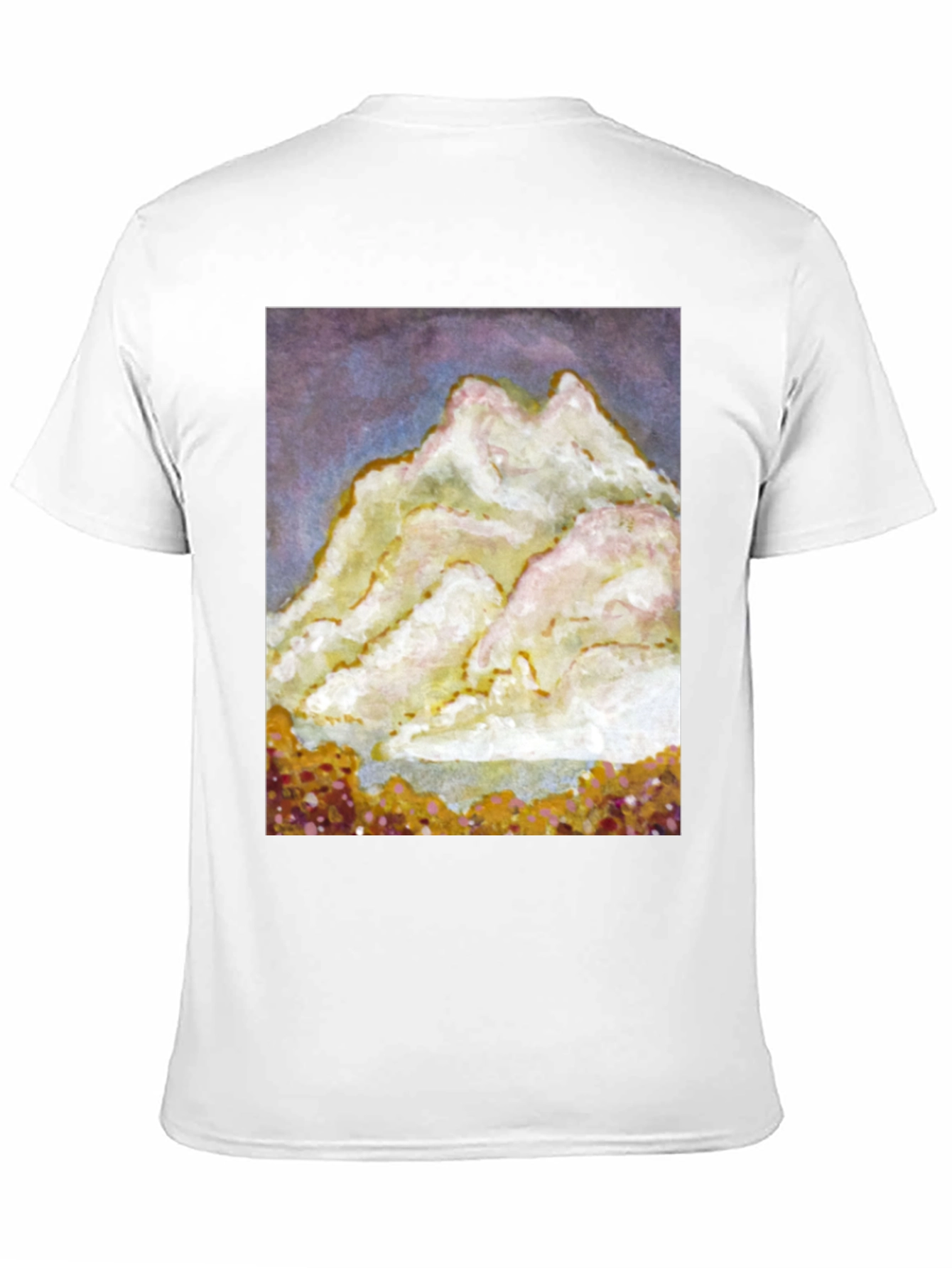 Show off your unique style with this eye-catching t-shirt! Featuring a captivating mountain painting, this tee is more than just clothing—it's wearable art. The artwork showcases a majestic mountain range rendered in soothing colors, creating a calming and artistic vibe. Made from a comfortable, dark-colored fabric, this t-shirt ensures all-day comfort and durability. Its classic fit makes it suitable for various occasions, from casual outings to artistic gatherings. Stand out from the crowd and express your appreciation for nature and art with this distinctive piece. It's the perfect addition to any wardrobe seeking a blend of comfort and creativity.